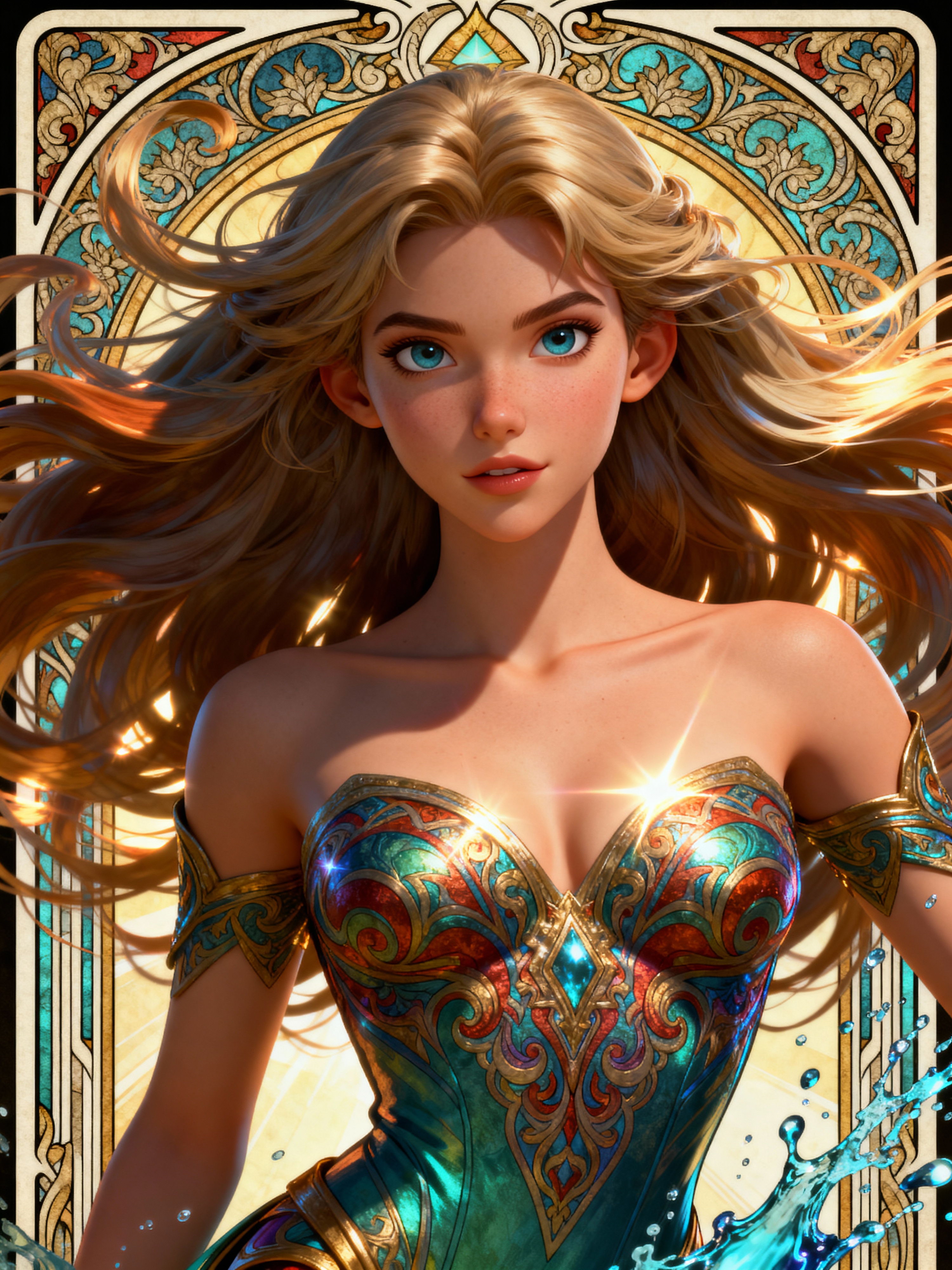 illustration of model as Mythical Tarot Cardin the style of moebius and mohrbacher and rossdraws and ross tran and alphonse mucha and ayami kojima, pixar style, maya engine, splash comics style, tarot card style, art nouveau, rich bright colours