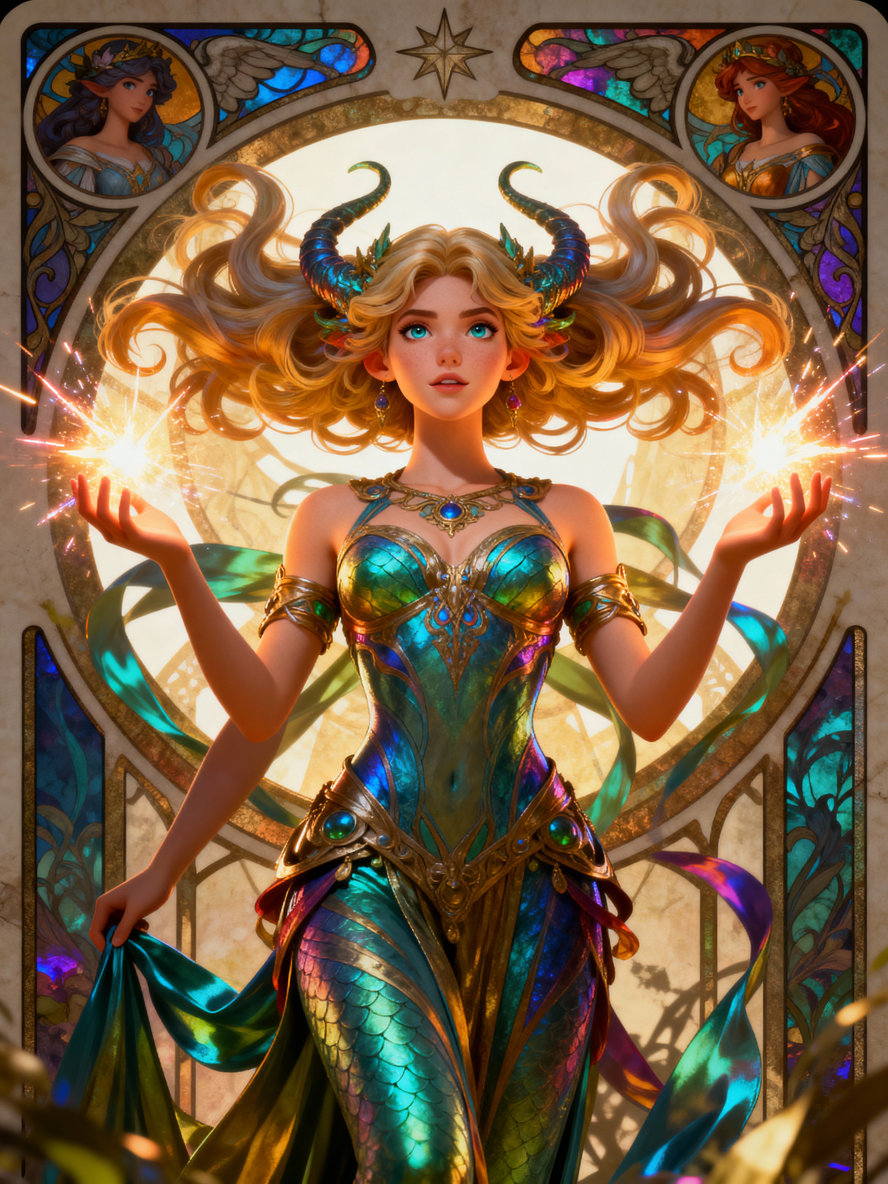 illustration of model as Mythical Tarot Cardin the style of moebius and mohrbacher and rossdraws and ross tran and alphonse mucha and ayami kojima, pixar style, maya engine, splash comics style, tarot card style, art nouveau, rich bright colours