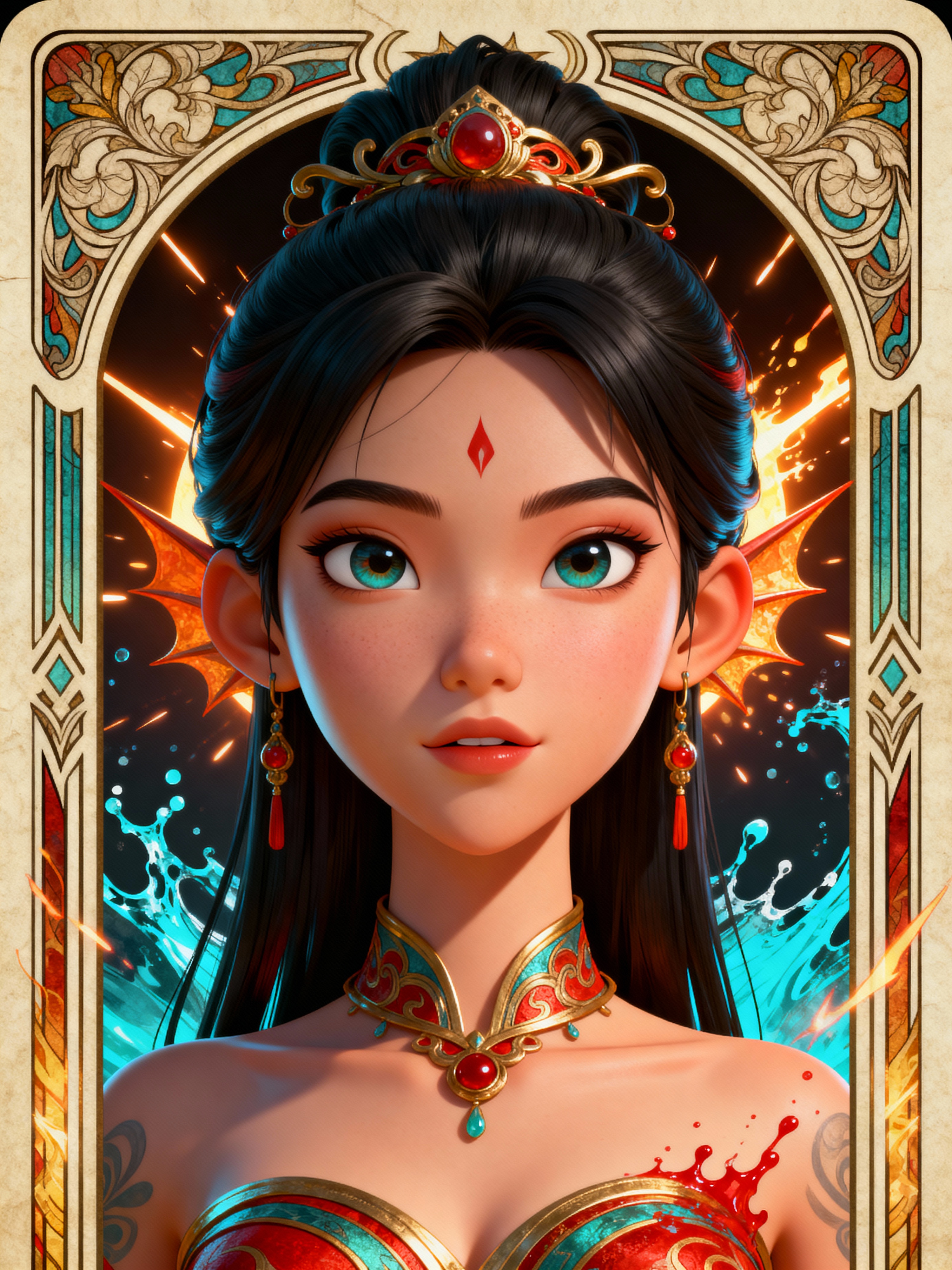 illustration of model as Mythical Tarot Cardin the style of moebius and mohrbacher and rossdraws and ross tran and alphonse mucha and ayami kojima, pixar style, maya engine, splash comics style, tarot card style, art nouveau, rich bright colours