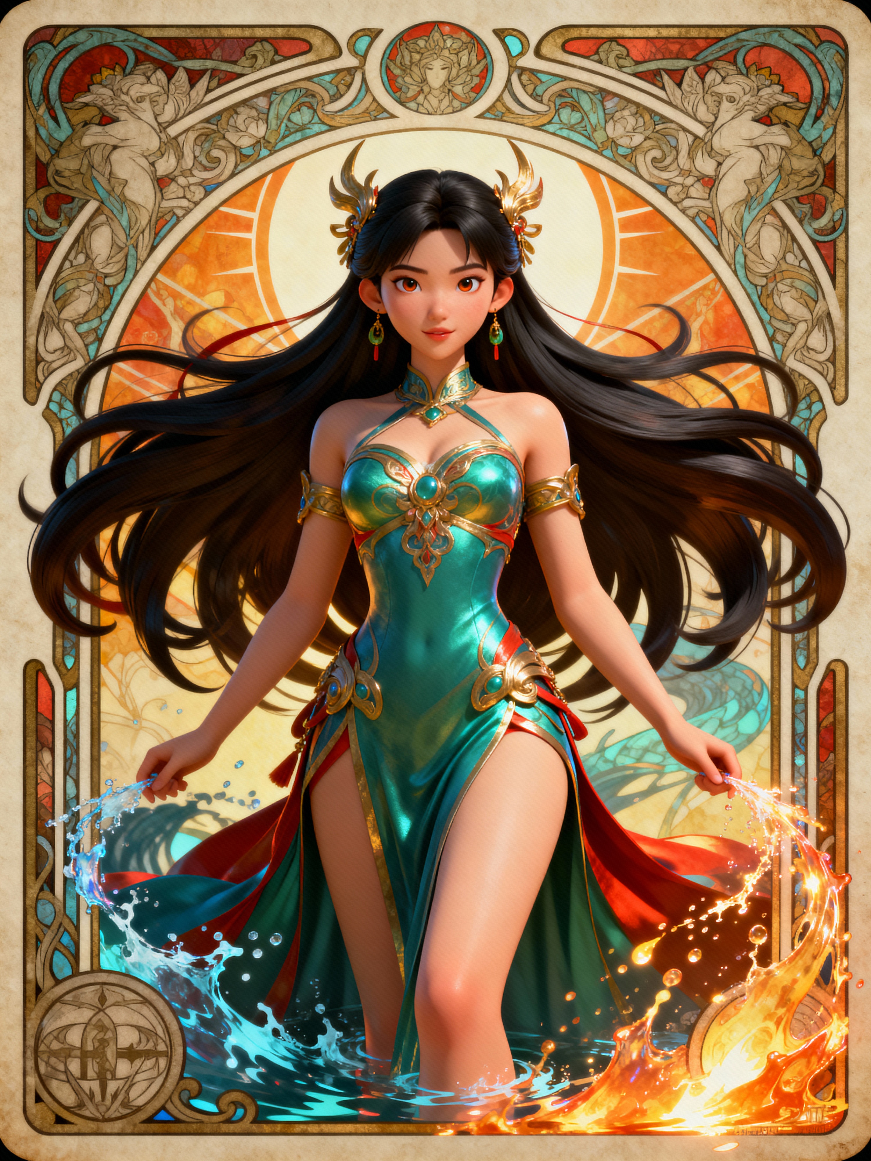 illustration of model as Mythical Tarot Cardin the style of moebius and mohrbacher and rossdraws and ross tran and alphonse mucha and ayami kojima, pixar style, maya engine, splash comics style, tarot card style, art nouveau, rich bright colours