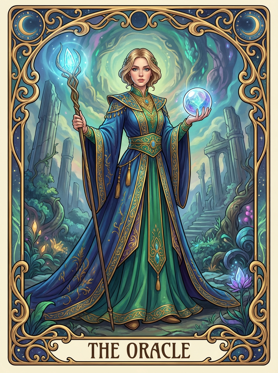 illustration of model as Mythical Tarot Cardin the style of moebius and mohrbacher and rossdraws and ross tran and alphonse mucha and ayami kojima, pixar style, maya engine, splash comics style, tarot card style, art nouveau, rich bright colours
