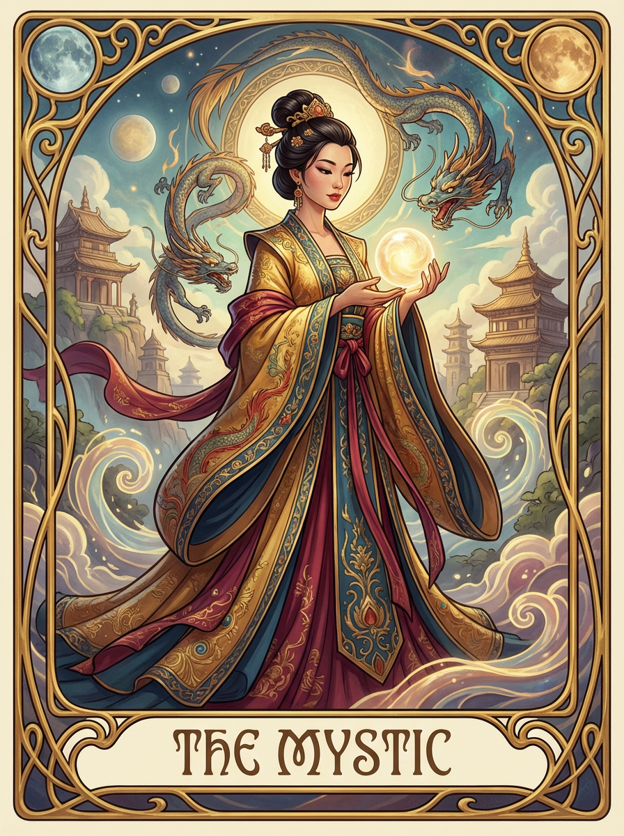 illustration of model as Mythical Tarot Cardin the style of moebius and mohrbacher and rossdraws and ross tran and alphonse mucha and ayami kojima, pixar style, maya engine, splash comics style, tarot card style, art nouveau, rich bright colours