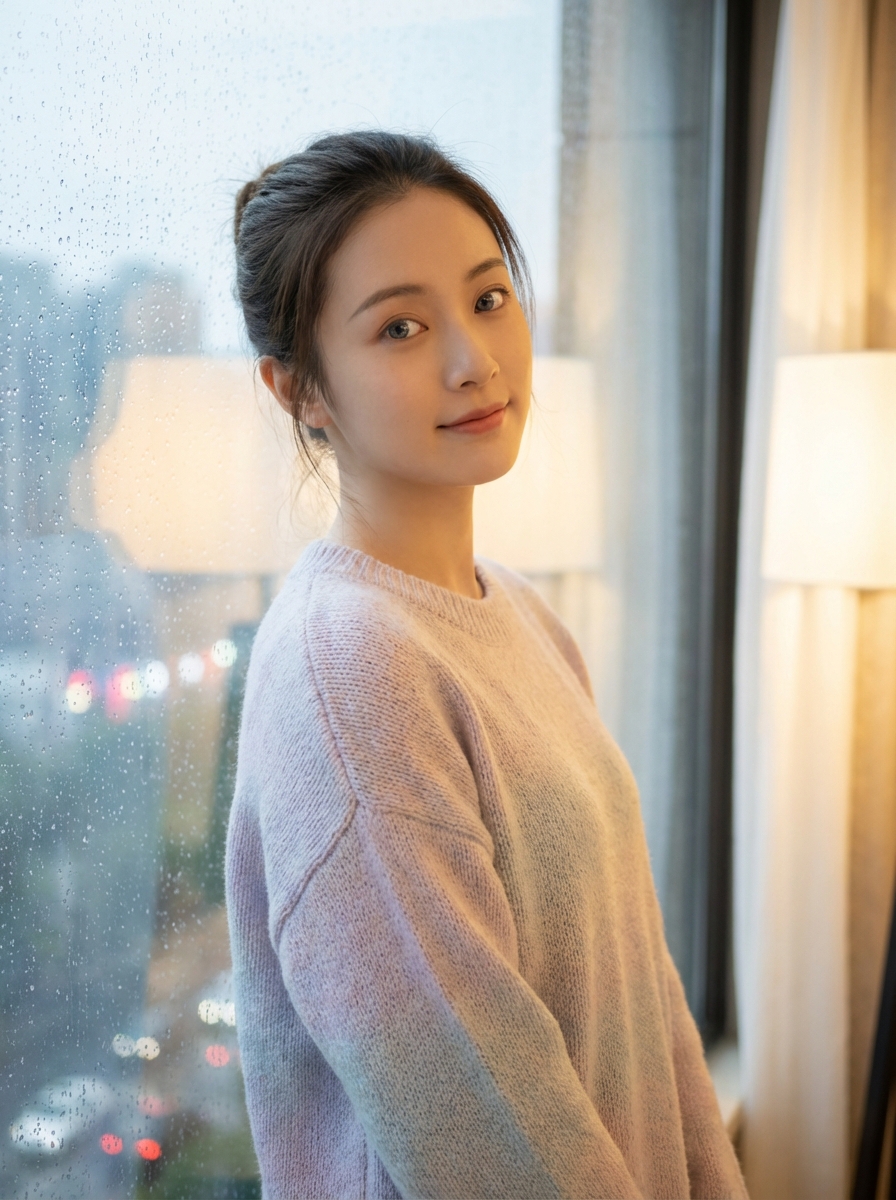 {"image_description": {"subject": {"type": "young model", "age_range": "early 20s", "appearance": {"skin": "clear, natural, softly glowing", "face": "delicate features, symmetrical, youthful", "eyes": "large, expressive, light-colored", "expression": "gentle, calm smile", "hair": {hair, "style": "neatly tied back with loose natural strands"}}, "pose": "standing close to a window, shoulders relaxed, head slightly tilted toward the camera", "gaze": "looking directly at the camera"}, "clothing": {"top": "soft pastel knitted sweater", "style": "minimal, cozy, casual indoor wear", "texture": "clearly visible knit fabric"}, "environment": {"location": "indoor room", "window": "large glass window with visible rain droplets and streaks", "outside_view": "blurred city street with soft bokeh lights", "interior_elements": "warm lamps and minimal decor in the background"}, "lighting": {"primary": "soft natural daylight coming through the window", "secondary": "warm ambient indoor lighting", "effect": "balanced highlights and gentle shadows on the face"}, "mood": {"atmosphere": "calm, cozy, intimate", "emotion": "peaceful, warm, slightly nostalgic"}, "technical_aesthetics": {"photorealism": "ultra-realistic", "camera_type": "professional DSLR", "lens": "85mm portrait lens", "aperture": "f/1.8", "depth_of_field": "shallow, soft background blur", "focus": "sharp focus on face and eyes", "color_grading": "natural skin tones with warm highlights", "noise": "minimal, clean image", "framing": "vertical portrait orientation"}}}