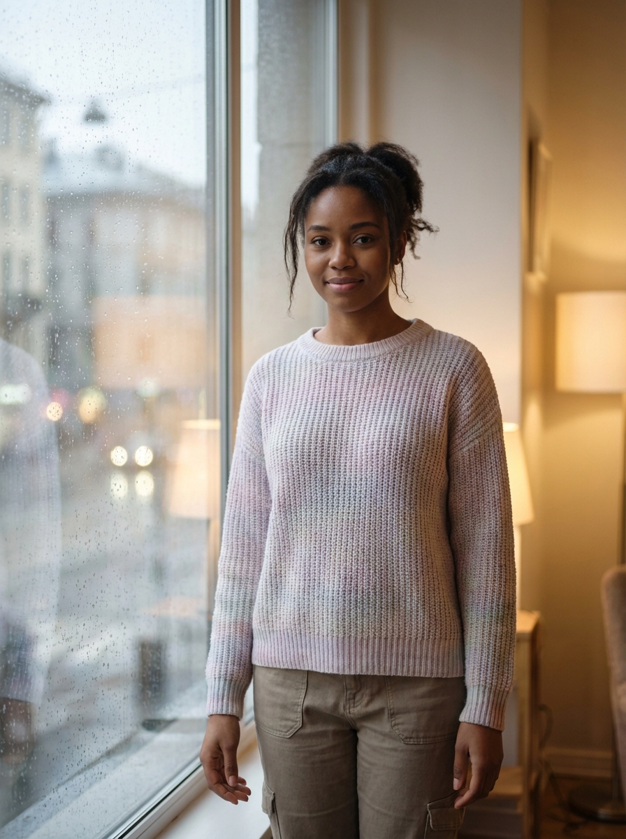 {"image_description": {"subject": {"type": "young model", "age_range": "early 20s", "appearance": {"skin": "clear, natural, softly glowing", "face": "delicate features, symmetrical, youthful", "eyes": "large, expressive, light-colored", "expression": "gentle, calm smile", "hair": {hair, "style": "neatly tied back with loose natural strands"}}, "pose": "standing close to a window, shoulders relaxed, head slightly tilted toward the camera", "gaze": "looking directly at the camera"}, "clothing": {"top": "soft pastel knitted sweater", "style": "minimal, cozy, casual indoor wear", "texture": "clearly visible knit fabric"}, "environment": {"location": "indoor room", "window": "large glass window with visible rain droplets and streaks", "outside_view": "blurred city street with soft bokeh lights", "interior_elements": "warm lamps and minimal decor in the background"}, "lighting": {"primary": "soft natural daylight coming through the window", "secondary": "warm ambient indoor lighting", "effect": "balanced highlights and gentle shadows on the face"}, "mood": {"atmosphere": "calm, cozy, intimate", "emotion": "peaceful, warm, slightly nostalgic"}, "technical_aesthetics": {"photorealism": "ultra-realistic", "camera_type": "professional DSLR", "lens": "85mm portrait lens", "aperture": "f/1.8", "depth_of_field": "shallow, soft background blur", "focus": "sharp focus on face and eyes", "color_grading": "natural skin tones with warm highlights", "noise": "minimal, clean image", "framing": "vertical portrait orientation"}}}