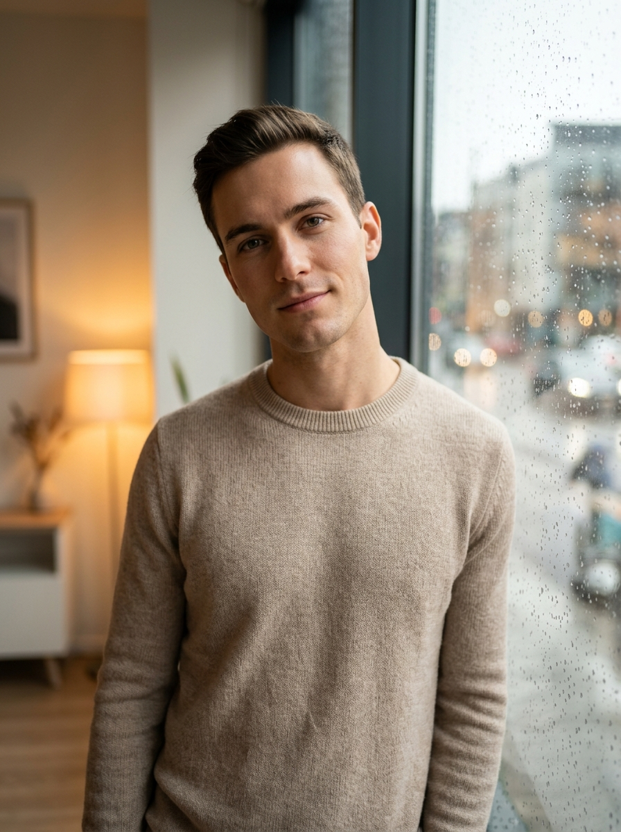 {"image_description":{"subject":{"type":"young male model","age_range":"early 20s","appearance":{"skin":"clear, natural, softly glowing","face":"defined features, symmetrical, youthful","eyes":"piercing, expressive, light-colored","expression":"subtle, confident smile","hair":{"style":"short and neatly styled with textured strands"}},"pose":"standing close to a window, shoulders broad and relaxed, head slightly tilted toward the camera","gaze":"looking directly at the camera"},"clothing":{"top":"soft neutral knitted sweater","style":"minimal, cozy, casual indoor wear","texture":"clearly knit fabric"},"environment":{"location":"indoor room","window":"large glass window with rain droplets and streaks","outside_view":"blurred city street with soft bokeh lights","interior_elements":"warm lamps and minimal decor in the background"},"lighting":{"primary":"soft natural daylight coming through the window","secondary":"warm ambient indoor lighting","effect":"balanced highlights and gentle shadows on the face"},"mood":{"atmosphere":"calm, cozy, ","emotion":"peaceful, warm, slightly nostalgic"},"technical_aesthetics":{"photorealism":"ultra-realistic","camera_type":"professional DSLR","lens":"85mm portrait lens","aperture":"f\/1.8","depth_of_field":"shallow, soft background blur","focus":"sharp focus on face and eyes","color_grading":"natural skin tones with warm highlights","noise":"minimal, clean image","framing":"vertical portrait orientation"}}}