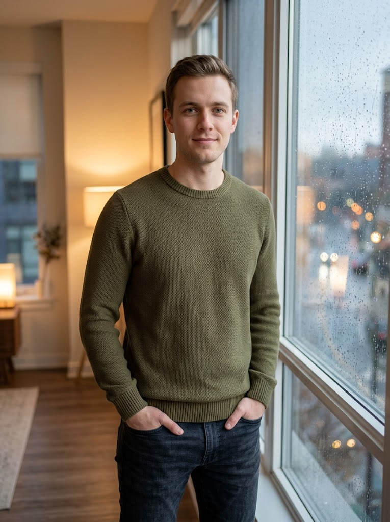 {"image_description":{"subject":{"type":"young male model","age_range":"early 20s","appearance":{"skin":"clear, natural, softly glowing with light stubble","face":"defined features, symmetrical, youthful","eyes":"piercing, expressive, light-colored","expression":"subtle, confident smile","hair":{"style":"short textured crop with neat sides"}},"pose":"standing confidently near a window, shoulders broad and relaxed, head slightly turned toward the camera","gaze":"looking directly at the camera"},"clothing":{"top":"soft neutral knitted sweater","style":"minimal, cozy, casual indoor wear","texture":"clearly knit fabric"},"environment":{"location":"indoor room","window":"large glass window with rain droplets and streaks","outside_view":"blurred city street with soft bokeh lights","interior_elements":"warm lamps and minimal decor in the background"},"lighting":{"primary":"soft natural daylight coming through the window","secondary":"warm ambient indoor lighting","effect":"balanced highlights and gentle shadows on the face"},"mood":{"atmosphere":"calm, cozy, ","emotion":"peaceful, warm, slightly nostalgic"},"technical_aesthetics":{"photorealism":"ultra-realistic","camera_type":"professional DSLR","lens":"85mm portrait lens","aperture":"f\/1.8","depth_of_field":"shallow, soft background blur","focus":"sharp focus on face and eyes","color_grading":"natural skin tones with warm highlights","noise":"minimal, clean image","framing":"vertical portrait orientation"}}}