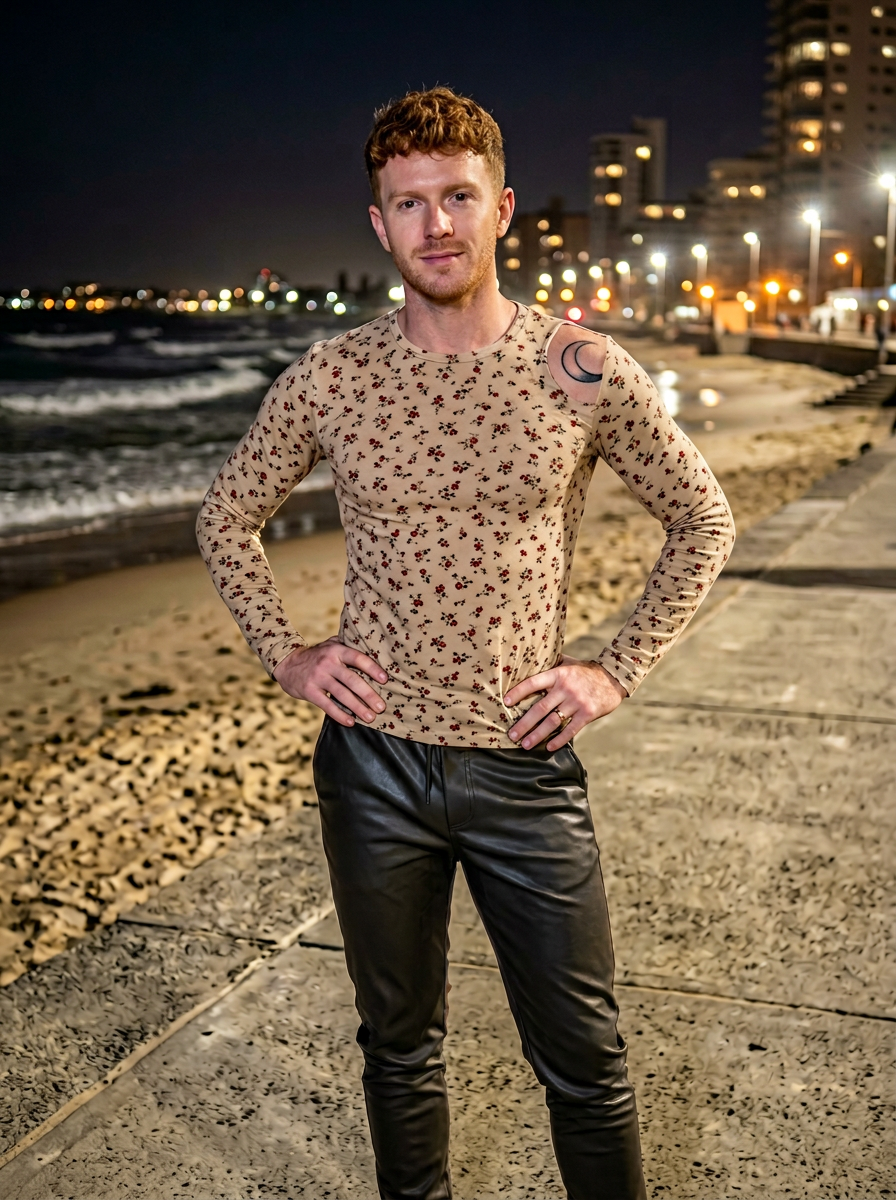 {"image_details":{"subject":{"gender":"male","hair_color":"reddish-brown, short, textured wavy","skin_tone":"light, with light stubble","features":"crescent moon tattoo on left shoulder","pose":"standing confidently on a boardwalk, facing forward, hands resting on hips, slight smile","gaze":"direct at camera"},"attire":{"top":"beige fitted t-shirt with small red and green floral pattern, long sleeves","bottoms":"faux leather joggers, slim-fit","accessories":"simple ring on right hand"},"environment":{"location":"beach boardwalk at night","elements":["concrete promenade","sandy beach","ocean waves","distant city skyline with illuminated buildings and streetlights"],"atmosphere":"calm, coastal night"},"lighting":{"type":"mixed artificial and natural night light","sources":["city lights","moonlight","camera flash (creating soft highlights on subject)"],"quality":"warm, ambient, with direct illumination on the subject"},"styling":{"makeup":"natural look, defined eyes, natural features, natural features","hair":"casually styled, tousled"},"mood":"confident, serene, relaxed","photographic_style":{"type":"ultra-photorealistic portrait","camera":"DSLR","lens":"50mm f\/1.8","settings":{"shutter_speed":"1\/60s","aperture":"f\/2.8","iso":"1600"},"details":["high resolution","sharp focus on subject","shallow depth of field blurred background","night photography","realistic textures (fabric, leather, sand, concrete)"]}}}