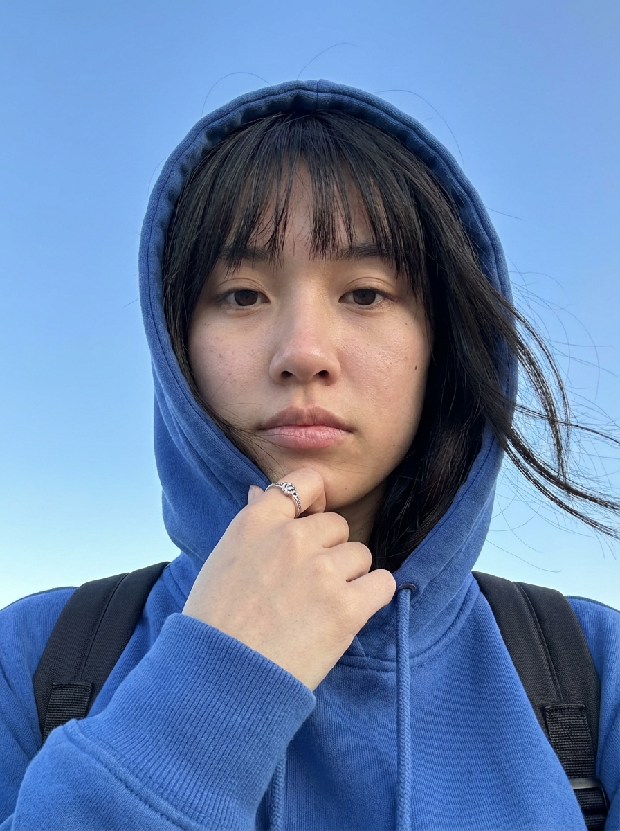 {"image_generation": {"face": {"preserve_original": true, "reference_match": true, "description": "Preserve the same facial features, soft natural makeup, lip shape, eye details, and calm expression from the reference image."}, "photo_style": {"type": "outdoor casual portrait", "camera_angle": "close-up portrait, slightly low angle", "lighting": "soft natural daylight with even exposure", "mood": "calm, minimal, slightly introspective", "texture": "natural skin texture with soft details and smooth tones", "focus": "sharp focus on face, clean blurred background"}, "subject": {"pose": "close-up portrait with one hand resting near the chin, head slightly tilted forward", "expression": "neutral to soft pout, relaxed and confident", "hair": {"style": "straight hair with soft bangs, some strands moving naturally in the breeze", hair}, "clothing": {"type": "casual streetwear", "details": "oversized blue hoodie with hood worn up"}, "accessories": {"ring": "simple minimal ring on finger", "bag": "backpack straps visible on shoulders"}}, "environment": {"setting": "outdoor open space", "background": "clear blue sky with no distractions", "atmosphere": "fresh, open, minimal"}, "aesthetic": {"style": "clean Instagram-style portrait", "features": ["minimal color palette", "soft natural lighting", "casual hoodie fashion", "clean sky background", "modern lifestyle vibe"]}}}