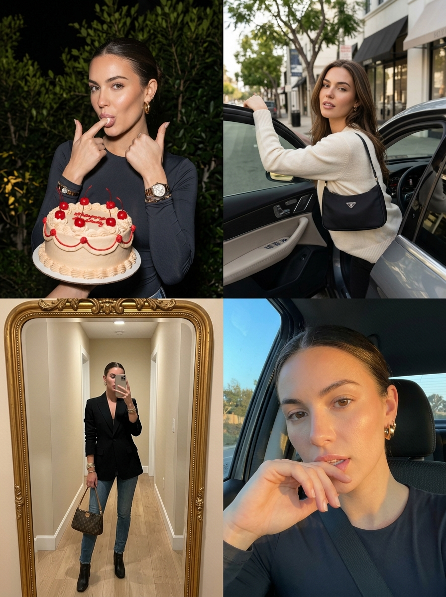 {"image_layout":"2x2 grid collage featuring four distinct photographs of the same model subject.","identity_lock":{"reference":"uploaded image","rules":["Preserve the exact same face, facial structure, body shape, skin tone, and overall identity as the uploaded reference image","Do NOT change the person\u2019s appearance, age, ethnicity, or attractiveness","The subject must clearly be the same individual in all four panels"]},"clothing_rules":{"base_rule":"Clothing may either match the uploaded image exactly OR be naturally inferred outfits that the same person would realistically wear","constraints":["No drastic style change","No costume-like outfits","Outfits must feel coherent with the subject\u2019s real-life fashion sense"]},"panels":[{"position":"top_left","setting":"Outdoors at night, dark background with softly illuminated green foliage","action":"She holds a cake in one hand and licks frosting from the index finger of the other hand","outfit":{"description":"A sleek, night-out look that fits the subject\u2019s real style (can match the uploaded outfit or a realistic alternative)","jewelry":"Gold-toned accessories such as a wristwatch, bracelet, rings, and small if(gender=f){hoop earrings } "},"props":{"item":"Round frosted cake","details":["Red cherries on top","Clean piping along the edges","icing text on the cake"]},"mood":"Playful, confident, slightly cheeky"},{"position":"top_right","setting":"Daytime upscale city street with storefronts and trees","action":"She leans casually out of the open door of a luxury car, looking directly at the camera","outfit":{"description":"Casual-chic daytime outfit consistent with her identity (may reuse the uploaded outfit or a plausible streetwear variation)","accessories":"Minimal jewelry, small shoulder bag"},"lighting":"Bright natural daylight with realistic shadows","mood":"Confident, aspirational, influencer-like"},{"position":"bottom_left","setting":"Indoor hallway with beige walls and wooden flooring","action":"Full-body mirror selfie","outfit":{"description":"A coordinated outfit suitable for an indoor mirror selfie, consistent with her fashion sense","accessories":"Designer-style handbag , stacked bracelets"},"background_details":["Large gold-framed mirror leaning against the wall","Minimal interior decor such as dried plants","Doorway in the reflection"],"mood":"Stylish, composed, fashion-focused"},{"position":"bottom_right","setting":"Inside a vehicle or near a window during golden hour","action":"Close-up selfie with her hand near her mouth or chin","outfit":{"description":"Soft-toned top with light outerwear, aligned with her real-world style"},"hair_styling":"Hair styling may vary slightly (e.g., tied back) as long as it remains clearly the same person","background_details":"Warm sunlight, car window frame, outdoor scenery ","mood":" , relaxed, candid"}],"photography_style":{"type":"Realistic lifestyle photography","quality":"High-resolution, natural textures, no artificial beautification","lighting":"Scenario-appropriate natural lighting in each panel"},"negative_prompt":["face change","different person","anime style","illustration","AI beauty exaggeration","plastic skin","unrealistic fashion","costume outfits","low resolution"]}