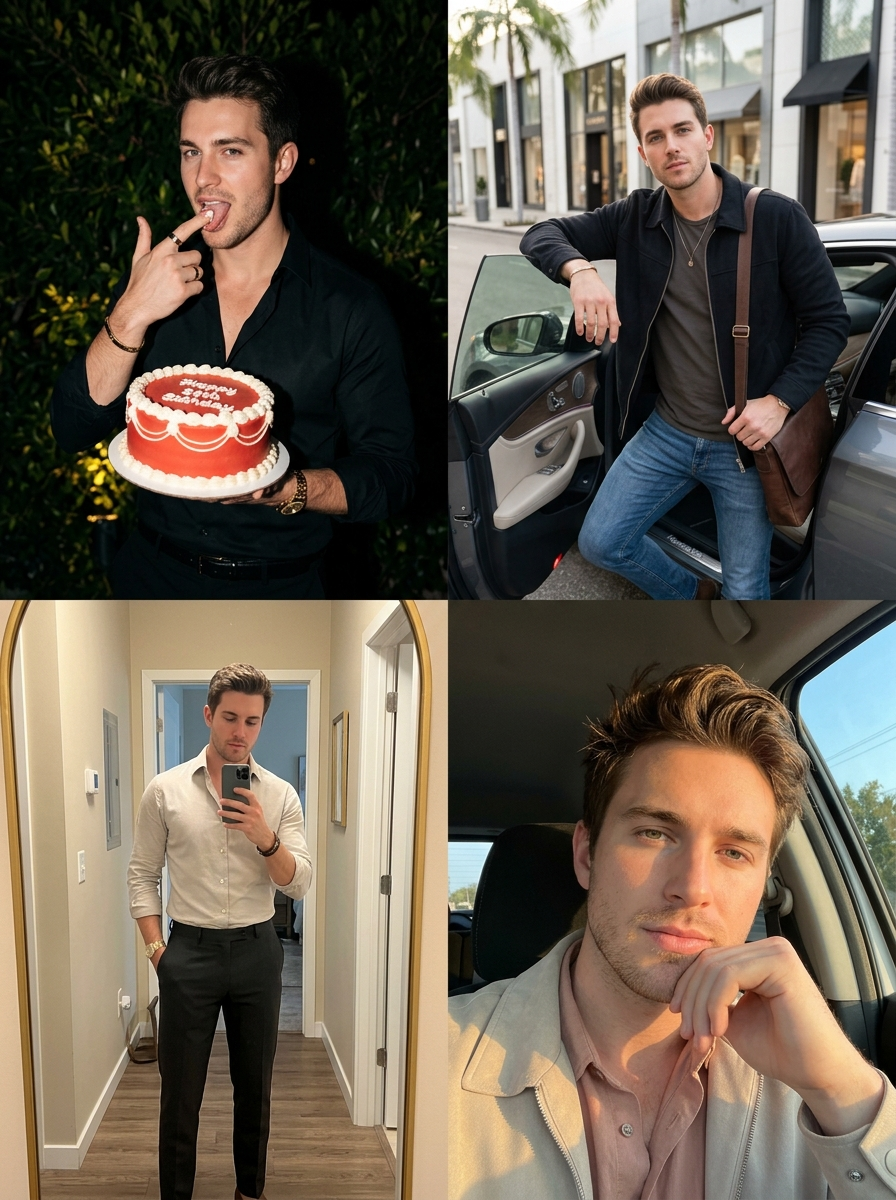 {"image_layout":"2x2 grid collage featuring four distinct photographs of the same model subject.","identity_lock":{"reference":"uploaded image","rules":["Preserve the exact same face, facial structure, body shape, skin tone, and overall identity as the uploaded reference image","Do NOT change the person\u2019s appearance, age, ethnicity, or attractiveness","The subject must clearly be the same individual in all four panels"]},"clothing_rules":{"base_rule":"Clothing may either match the uploaded image exactly OR be naturally inferred outfits that the same person would realistically wear","constraints":["No drastic style change","No costume-like outfits","Outfits must feel coherent with the subject\u2019s real-life fashion sense"]},"panels":[{"position":"top_left","setting":"Outdoors at night, dark background with softly illuminated green foliage","action":"He holds a cake in one hand and licks frosting from the index finger of the other hand","outfit":{"description":"A sleek, night-out look that fits the subject\u2019s real style (can match the uploaded outfit or a realistic alternative)","jewelry":"Gold-toned accessories such as a wristwatch, bracelet, rings"},"props":{"item":"Round frosted cake","details":["Red cherries on top","Clean piping along the edges","icing text on the cake"]},"mood":"Playful, confident, slightly cheeky"},{"position":"top_right","setting":"Daytime upscale city street with storefronts and trees","action":"He leans casually out of the open door of a luxury car, looking directly at the camera","outfit":{"description":"Casual-chic daytime outfit consistent with his identity (may reuse the uploaded outfit or a plausible streetwear variation)","accessories":"Minimal jewelry, leather messenger bag"},"lighting":"Bright natural daylight with realistic shadows","mood":"Confident, aspirational, influencer-like"},{"position":"bottom_left","setting":"Indoor hallway with beige walls and wooden flooring","action":"Full-body mirror selfie","outfit":{"description":"A coordinated outfit suitable for an indoor mirror selfie, consistent with his fashion sense","accessories":"Designer-style minimal accessories such as a watch, single leather bracelet"},"background_details":["Large gold-framed mirror leaning against the wall","Minimal interior decor such as dried plants","Doorway in the reflection"],"mood":"Stylish, composed, fashion-focused"},{"position":"bottom_right","setting":"Inside a vehicle or near a window during golden hour","action":"Close-up selfie with his hand near his mouth or chin","outfit":{"description":"Soft-toned shirt with light jacket, aligned with his real-world style"},"hair_styling":"Hair styling may vary slightly (e.g., tousled) as long as it remains clearly the same person","background_details":"Warm sunlight, car window frame, outdoor scenery ","mood":" , relaxed, candid"}],"photography_style":{"type":"Realistic lifestyle photography","quality":"High-resolution, natural textures, no artificial beautification","lighting":"Scenario-appropriate natural lighting in each panel"},"negative_prompt":["face change","different person","anime style","illustration","AI beauty exaggeration","plastic skin","unrealistic fashion","costume outfits","low resolution"]}
