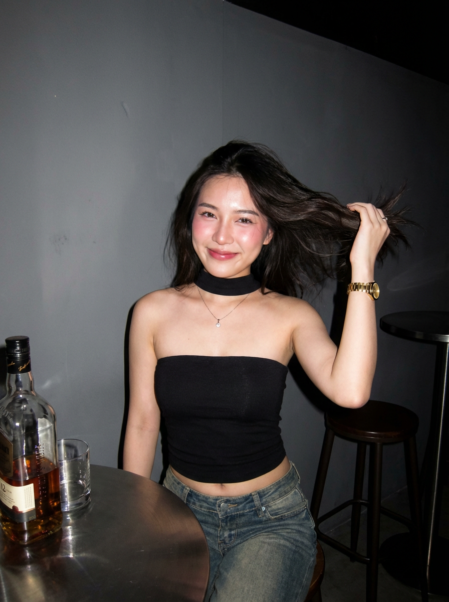 {"image_parameters":{"style":"Canon IXUS aesthetic","type":"Point-and-shoot photography","quality":"Hyper-realistic","tone":"Sharp, direct","lighting_and_atmosphere":"Realistic, flash-style/direct lighting"},"subject":{"constraints":{"facial_identity":"Match reference image exactly 100%","face_edits":"None allowed"},"hair":{"style":"Long, natural, lightly messy layered look","movement":"Blowing gently in the wind","details":"Strands slightly covering part of face"},"makeup":{"cheeks_and_nose":"Soft pink blush with blurred effect","lips":"Subtle pink-orange tinted outline"},"expression":["Cute","Naive","Cheerful","Slightly sexy/undone charm"],"pose":{"body_position":"Half-sitting, half-standing","action":"Flicking hair"},"clothing":{"top":"Black strapless top","bottom":"Low-waisted jeans with a floating waistline","neck":"Thin black fabric choker/wrap"},"accessories":["Small pendant necklace","Gold watch"]},"environment":{"setting":"Modern pub","foreground_props":["Round table","Bottle of liquor","Glass of liquor"]}}