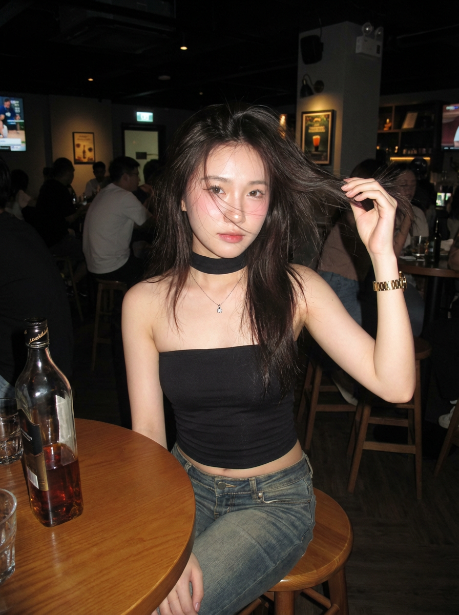 {"image_parameters":{"style":"Canon IXUS aesthetic","type":"Point-and-shoot photography","quality":"Hyper-realistic","tone":"Sharp, direct","lighting_and_atmosphere":"Realistic, flash-style/direct lighting"},"subject":{"constraints":{"facial_identity":"Match reference image exactly 100%","face_edits":"None allowed"},"hair":{"style":"Long, natural, lightly messy layered look","movement":"Blowing gently in the wind","details":"Strands slightly covering part of face"},"makeup":{"cheeks_and_nose":"Soft pink blush with blurred effect","lips":"Subtle pink-orange tinted outline"},"expression":["Cute","Naive","Cheerful","Slightly sexy/undone charm"],"pose":{"body_position":"Half-sitting, half-standing","action":"Flicking hair"},"clothing":{"top":"Black strapless top","bottom":"Low-waisted jeans with a floating waistline","neck":"Thin black fabric choker/wrap"},"accessories":["Small pendant necklace","Gold watch"]},"environment":{"setting":"Modern pub","foreground_props":["Round table","Bottle of liquor","Glass of liquor"]}}