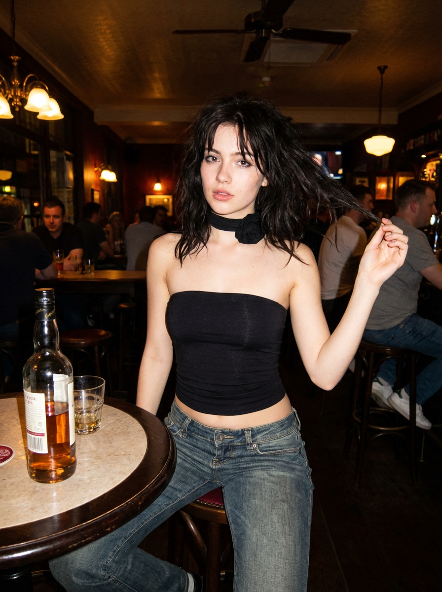 {"image_parameters":{"style":"Canon IXUS aesthetic","type":"Point-and-shoot photography","quality":"Hyper-realistic","tone":"Sharp, direct","lighting_and_atmosphere":"Realistic, flash-style/direct lighting"},"subject":{"constraints":{"facial_identity":"Match reference image exactly 100%","face_edits":"None allowed"},"hair":{"style":"Long, natural, lightly messy layered look","movement":"Blowing gently in the wind","details":"Strands slightly covering part of face"},"makeup":{"cheeks_and_nose":"Soft pink blush with blurred effect","lips":"Subtle pink-orange tinted outline"},"expression":["Cute","Naive","Cheerful","Slightly sexy/undone charm"],"pose":{"body_position":"Half-sitting, half-standing","action":"Flicking hair"},"clothing":{"top":"Black strapless top","bottom":"Low-waisted jeans with a floating waistline","neck":"Thin black fabric choker/wrap"},"accessories":["Small pendant necklace","Gold watch"]},"environment":{"setting":"Modern pub","foreground_props":["Round table","Bottle of liquor","Glass of liquor"]}}