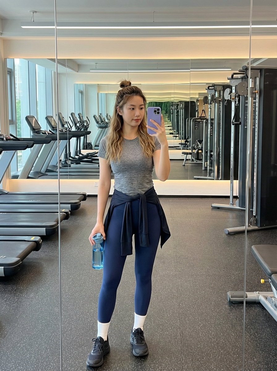 {"image_prompt": {"reference": {"face_identity": "use uploaded reference image", "identity_lock": true, "face_accuracy": "100% identical to reference — same facial structure, proportions, skin texture, expression, and details"}, "subject": {"type": "young model", "appearance": {"hair": {hair, "style": "long wavy hair with a half-up messy bun , loose strands framing the face"}, "skin": {"tone": "same as reference image", "texture": "natural, realistic"}, "expression": "calm, composed, slightly focused", "gaze": "looking at phone screen"}, "pose": {"stance": "standing with one leg slightly forward", "hands": {"right": "holding a purple smartphone for a mirror selfie", "left": "holding a transparent water bottle with blue liquid"}}}, "outfit": {"top": {"primary": "fitted short-sleeve t-shirt", "layer": "long-sleeve shirt tied around the waist"}, "bottom": {"type": "high-waisted athletic leggings ", "color": "navy blue"}, "footwear": {"shoes": "athletic sneakers", "socks": "crew socks"}}, "environment": {"location": "modern indoor gym", "features": ["large wall mirrors", "treadmills", "weight machines", "rubber gym flooring", "exercise mats on the floor"], "reflection": "mirror seam visible vertically in frame"}, "lighting": {"type": "bright overhead fluorescent gym lighting", "quality": "even, neutral illumination with minimal shadows"}, "composition": {"shot_type": "full-body mirror selfie", "camera_angle": "eye-level", "framing": "centered subject", "style": "casual fitness lifestyle photograph"}, "image_style": {"realism": "highly photorealistic", "detail": "sharp clothing textures and clear gym background", "mood": "clean, modern, casual", "resolution": "high resolution"}}}