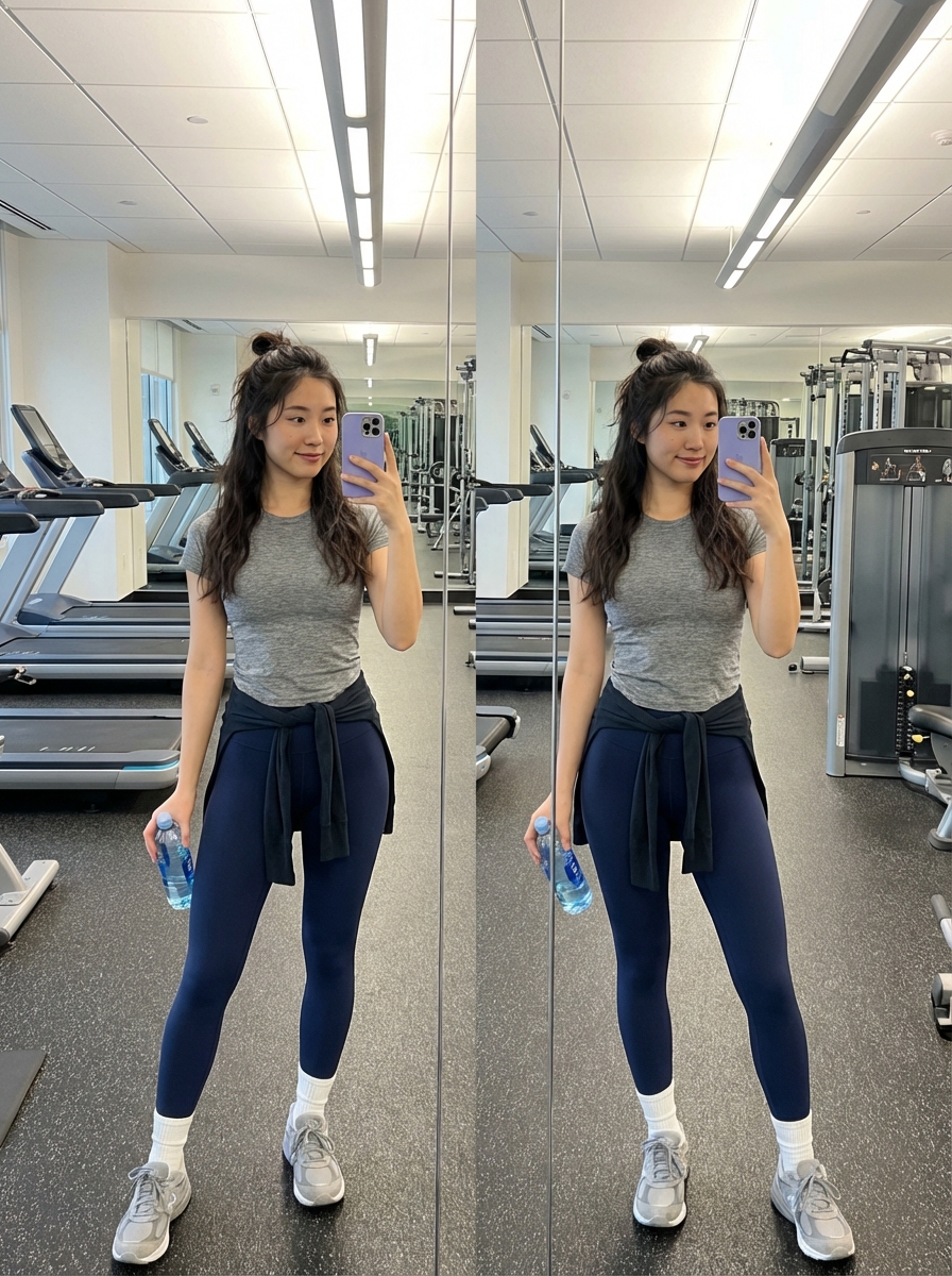 {"image_prompt": {"reference": {"face_identity": "use uploaded reference image", "identity_lock": true, "face_accuracy": "100% identical to reference — same facial structure, proportions, skin texture, expression, and details"}, "subject": {"type": "young model", "appearance": {"hair": {hair, "style": "long wavy hair with a half-up messy bun , loose strands framing the face"}, "skin": {"tone": "same as reference image", "texture": "natural, realistic"}, "expression": "calm, composed, slightly focused", "gaze": "looking at phone screen"}, "pose": {"stance": "standing with one leg slightly forward", "hands": {"right": "holding a purple smartphone for a mirror selfie", "left": "holding a transparent water bottle with blue liquid"}}}, "outfit": {"top": {"primary": "fitted short-sleeve t-shirt", "layer": "long-sleeve shirt tied around the waist"}, "bottom": {"type": "high-waisted athletic leggings ", "color": "navy blue"}, "footwear": {"shoes": "athletic sneakers", "socks": "crew socks"}}, "environment": {"location": "modern indoor gym", "features": ["large wall mirrors", "treadmills", "weight machines", "rubber gym flooring", "exercise mats on the floor"], "reflection": "mirror seam visible vertically in frame"}, "lighting": {"type": "bright overhead fluorescent gym lighting", "quality": "even, neutral illumination with minimal shadows"}, "composition": {"shot_type": "full-body mirror selfie", "camera_angle": "eye-level", "framing": "centered subject", "style": "casual fitness lifestyle photograph"}, "image_style": {"realism": "highly photorealistic", "detail": "sharp clothing textures and clear gym background", "mood": "clean, modern, casual", "resolution": "high resolution"}}}