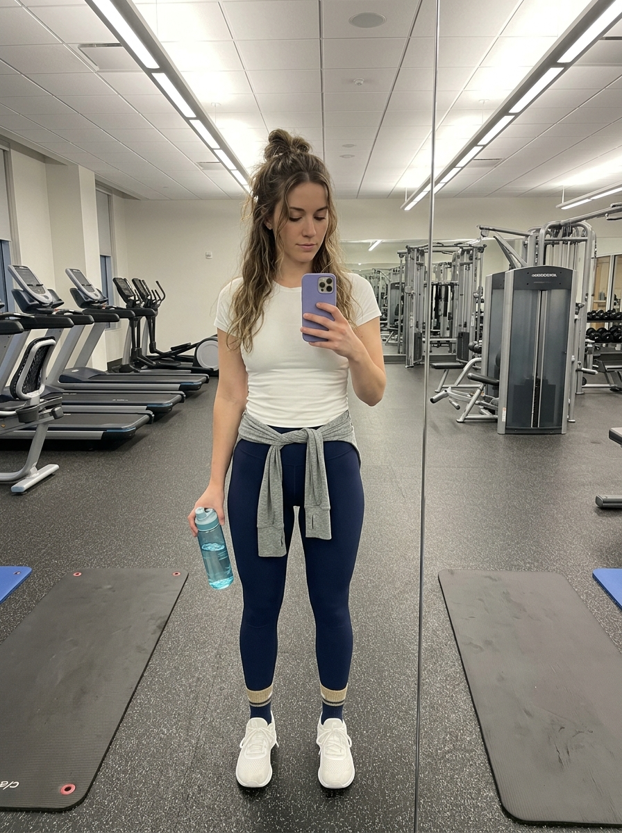 {"image_prompt": {"reference": {"face_identity": "use uploaded reference image", "identity_lock": true, "face_accuracy": "100% identical to reference — same facial structure, proportions, skin texture, expression, and details"}, "subject": {"type": "young model", "appearance": {"hair": {hair, "style": "long wavy hair with a half-up messy bun , loose strands framing the face"}, "skin": {"tone": "same as reference image", "texture": "natural, realistic"}, "expression": "calm, composed, slightly focused", "gaze": "looking at phone screen"}, "pose": {"stance": "standing with one leg slightly forward", "hands": {"right": "holding a purple smartphone for a mirror selfie", "left": "holding a transparent water bottle with blue liquid"}}}, "outfit": {"top": {"primary": "fitted short-sleeve t-shirt", "layer": "long-sleeve shirt tied around the waist"}, "bottom": {"type": "high-waisted athletic leggings ", "color": "navy blue"}, "footwear": {"shoes": "athletic sneakers", "socks": "crew socks"}}, "environment": {"location": "modern indoor gym", "features": ["large wall mirrors", "treadmills", "weight machines", "rubber gym flooring", "exercise mats on the floor"], "reflection": "mirror seam vertically in frame"}, "lighting": {"type": "bright overhead fluorescent gym lighting", "quality": "even, neutral illumination with minimal shadows"}, "composition": {"shot_type": "full-body mirror selfie", "camera_angle": "eye-level", "framing": "centered subject", "style": "casual fitness lifestyle photograph"}, "image_style": {"realism": "highly photorealistic", "detail": "sharp clothing textures and clear gym background", "mood": "clean, modern, casual", "resolution": "high resolution"}}}