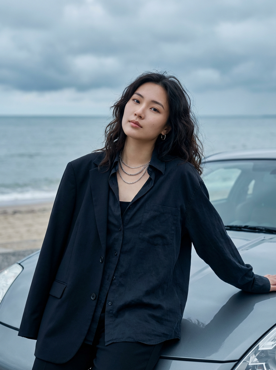 {"image_prompt": {"reference_image": "use_uploaded_photo", "face_preservation": {"enabled": true, "strength": "maximum", "instruction": "Do not alter facial structure, proportions, skin texture, expression, moles, or identity in any way. The face must match the reference image exactly."}, "subject": {"description": "A very beautiful young model", "expression": "calm, slightly dreamy", "gaze": "looking directly at the camera", "skin": "natural, realistic skin texture", "makeup": {"style": "minimal with soft smokey eye makeup", "focus": "eyes subtly emphasized"} , "hair": {hair, "length": "long", "style": "loose, wavy, slightly messy", "details": "a few strands partially covering her face for a natural, effortless look"}}, "outfit_and_accessories": {"top": {"type": "loose open shirt button", "fit": "relaxed", "details": "sleeves slightly rolled up at the wrists"}, "outerwear": {"type": "formal blazer", "placement": "draped over her left shoulder and resting slightly on the hood of the car"}, "bottom": {"type": "dark pants", hair, "visibility": "only partially visible"}, "jewelry": {"neck": "layered chunky silver chain necklaces", "ears": "small silver if(gender=f){hoop earrings } ", "wrist": "silver chain bracelet"}}, "pose_and_composition": {"pose": "sitting casually on the hood of a car", "support": "leaning slightly back against the hood", "framing": "medium close-up", "focus": "sharp focus on the subject", "background_blur": "slight natural bokeh"}, "environment": {"foreground": "glossy sports car hood with subtle reflections", "background": {"location": "beach or seaside", "details": ["faint sandy shoreline", "calm grayish-blue ocean", "overcast or heavily cloudy sky"], "atmosphere": "cool, melancholic, serene"}}, "lighting": {"type": "soft natural daylight", "condition": "overcast", "effect": "evenly diffused lighting with no harsh shadows"}, "photography_style": {"genre": "outdoor fashion portrait", "realism": "highly photorealistic", "color_tone": "cool and muted", "depth_of_field": "moderate with gentle background blur"}, "quality": {"resolution": "ultra high", "detail": "sharp fabric, hair, jewelry, and skin textures", "render_style": "natural DSLR photography look"}}}