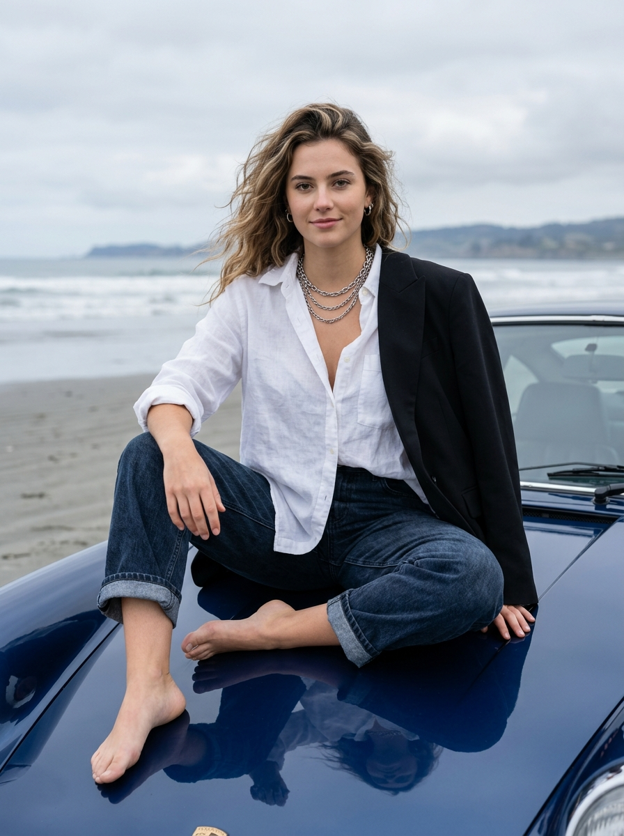 {"image_prompt": {"reference_image": "use_uploaded_photo", "face_preservation": {"enabled": true, "strength": "maximum", "instruction": "Do not alter facial structure, proportions, skin texture, expression, moles, or identity in any way. The face must match the reference image exactly."}, "subject": {"description": "A very beautiful young model", "expression": "calm, slightly dreamy", "gaze": "looking directly at the camera", "skin": "natural, realistic skin texture", "makeup": {"style": "minimal with soft smokey eye makeup", "focus": "eyes subtly emphasized"} , "hair": {hair, "length": "long", "style": "loose, wavy, slightly messy", "details": "a few strands partially covering her face for a natural, effortless look"}}, "outfit_and_accessories": {"top": {"type": "loose open shirt button", "fit": "relaxed", "details": "sleeves slightly rolled up at the wrists"}, "outerwear": {"type": "formal blazer", "placement": "draped over her left shoulder and resting slightly on the hood of the car"}, "bottom": {"type": "dark pants", hair, "visibility": "only partially visible"}, "jewelry": {"neck": "layered chunky silver chain necklaces", "ears": "small silver if(gender=f){hoop earrings } ", "wrist": "silver chain bracelet"}}, "pose_and_composition": {"pose": "sitting casually on the hood of a car", "support": "leaning slightly back against the hood", "framing": "medium close-up", "focus": "sharp focus on the subject", "background_blur": "slight natural bokeh"}, "environment": {"foreground": "glossy sports car hood with subtle reflections", "background": {"location": "beach or seaside", "details": ["faint sandy shoreline", "calm grayish-blue ocean", "overcast or heavily cloudy sky"], "atmosphere": "cool, melancholic, serene"}}, "lighting": {"type": "soft natural daylight", "condition": "overcast", "effect": "evenly diffused lighting with no harsh shadows"}, "photography_style": {"genre": "outdoor fashion portrait", "realism": "highly photorealistic", "color_tone": "cool and muted", "depth_of_field": "moderate with gentle background blur"}, "quality": {"resolution": "ultra high", "detail": "sharp fabric, hair, jewelry, and skin textures", "render_style": "natural DSLR photography look"}}}