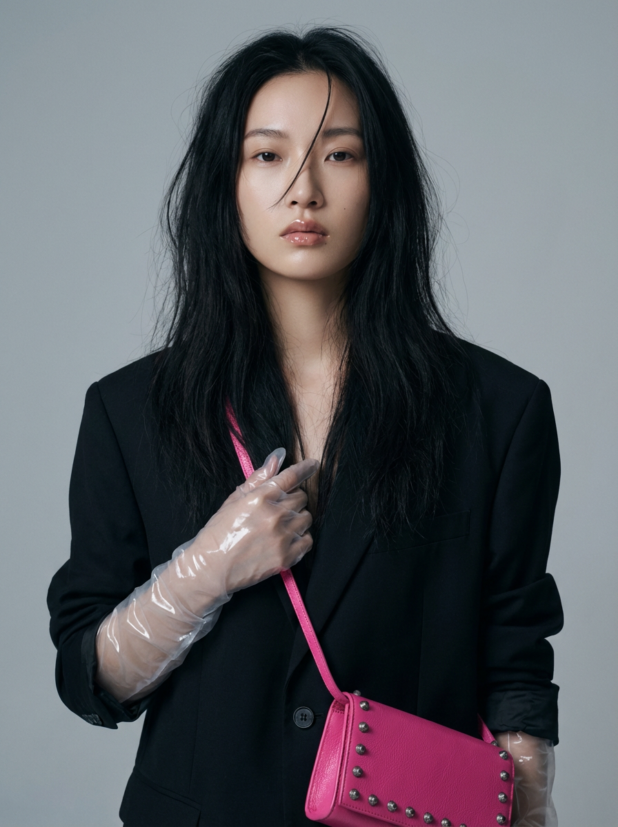 {"image_prompt": {"reference": {"source_image": "uploaded_photo", "face_identity_lock": true, "face_change": "none", "skin_tone": "preserve_exactly_from_reference"}, "subject": {"gender": "model", "pose": "close-up to medium close-up portrait", "gaze": "looking straight into the camera", "expression": "cold, strange, emotionally distant yet confident", "hair": {hair, "style": "long, messy, editorial texture", "details": "one loose strand falling across the face"}}, "outfit": {"top_layer": "oversized blazer", "inner_layer": "oversized top", "gloves": "glossy plastic gloves", "accessory": {"type": "hot pink stud clutch bag ", "brand_style": "Balenciaga-inspired", "wearing_style": "crossbody sling", "interaction": "one gloved hand lightly touching the sling"}}, if(gender=f){"makeup": {"style": "minimal high-fashion editorial", "skin": "natural matte finish, same texture as reference", "lips": "glossy", "blush} ": "soft pink-toned", "eyes": "clean, subtle definition, ethereal look"}, "environment": {"location": "high-fashion studio", "background": "plain soft grey backdrop", "mood": "modern, elegant, weird, editorial"}, "lighting": {"type": "soft diffused studio lighting", "effect": "gentle highlights on skin and lips", "shadows": "very soft, minimal contrast"}, "camera": {"angle": "close-up or medium close-up", "lens_style": "editorial portrait lens", "focus": "sharp focus on face with subtle background falloff"}, "rendering": {"style": "photorealistic", "quality": "8K", "finish": "matte cinematic editorial look", "detail_level": "high-detail skin texture and fabric realism"}}}