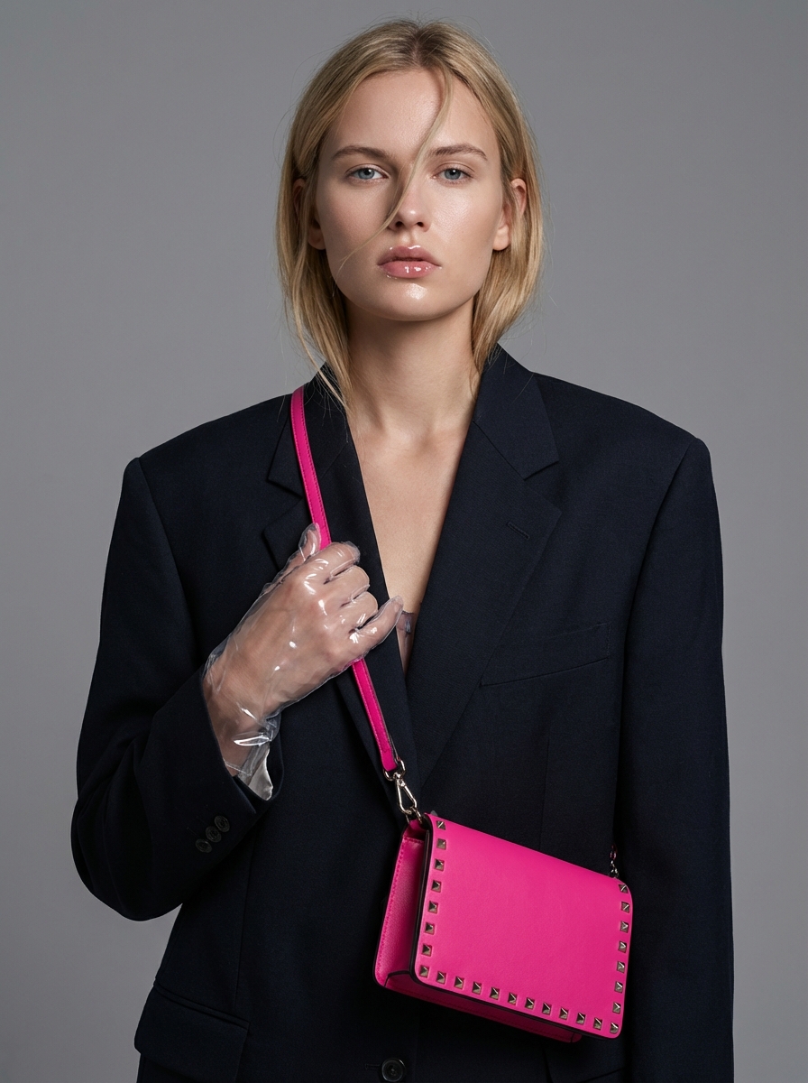 {"image_prompt": {"reference": {"source_image": "uploaded_photo", "face_identity_lock": true, "face_change": "none", "skin_tone": "preserve_exactly_from_reference"}, "subject": {"gender": "model", "pose": "close-up to medium close-up portrait", "gaze": "looking straight into the camera", "expression": "cold, strange, emotionally distant yet confident", "hair": {hair, "style": "long, messy, editorial texture", "details": "one loose strand falling across the face"}}, "outfit": {"top_layer": "oversized blazer", "inner_layer": "oversized top", "gloves": "glossy plastic gloves", "accessory": {"type": "hot pink stud clutch bag ", "brand_style": "Balenciaga-inspired", "wearing_style": "crossbody sling", "interaction": "one gloved hand lightly touching the sling"}}, if(gender=f){"makeup": {"style": "minimal high-fashion editorial", "skin": "natural matte finish, same texture as reference", "lips": "glossy", "blush} ": "soft pink-toned", "eyes": "clean, subtle definition, ethereal look"}, "environment": {"location": "high-fashion studio", "background": "plain soft grey backdrop", "mood": "modern, elegant, weird, editorial"}, "lighting": {"type": "soft diffused studio lighting", "effect": "gentle highlights on skin and lips", "shadows": "very soft, minimal contrast"}, "camera": {"angle": "close-up or medium close-up", "lens_style": "editorial portrait lens", "focus": "sharp focus on face with subtle background falloff"}, "rendering": {"style": "photorealistic", "quality": "8K", "finish": "matte cinematic editorial look", "detail_level": "high-detail skin texture and fabric realism"}}}