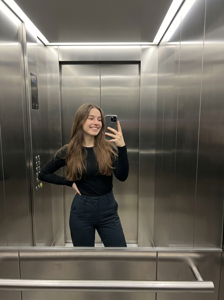 {"image_prompt": {"subject": {"description": "Young model with long, layered brown hair.", "outfit": "Black long-sleeved top or blazer.", "expression": "Genuine, animated smile with mouth slightly open as if mid-sentence or laughing. Eyes looking towards the phone screen/reflection."}, "pose_and_action": {"type": "Mirror selfie.", "details": "Standing pose, holding a smartphone aloft in one hand to capture reflection. Opposite hand resting casually on hip. Head tilted slightly in a relaxed manner."}, "environment": {"location": "Modern elevator interior.", "elements": "Brushed stainless steel walls and doors, subtle wood paneling accents, elevator button panel with illuminated buttons.", "reflections": "Glossy metallic surfaces reflecting the subject and the depth of the confined space."}, "lighting": {"source": "Soft, even overhead LED strip lighting.", "quality": "Flattering, diffuse light with subtle highlights on hair and skin. Cool tones from the metal contrasting with warm skin tones."}, "technical_style": {"aesthetic": "Photorealistic, candid, cinematic, high resolution, 8k.", "vibe": "Spontaneous, intimate, social media snapshot style."}}, "full_combined_prompt": "A photorealistic mirror selfie of a young model with long brown hair inside a modern elevator. She is wearing a black outfit, holding a smartphone to take the photo, and resting one hand on her hip. She has a genuine, animated smile with her mouth slightly open as if speaking. The background features brushed stainless steel panels, metal doors, and elevator buttons. The lighting is soft and overhead, creating reflections on the metallic surfaces. The vibe is candid and spontaneous. High detail, 8k resolution."}