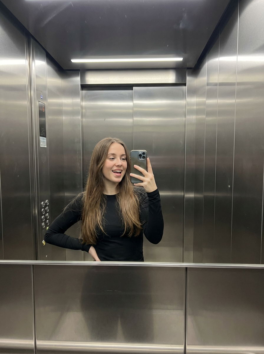 {"image_prompt": {"subject": {"description": "Young model with long, layered brown hair.", "outfit": "Black long-sleeved top or blazer.", "expression": "Genuine, animated smile with mouth slightly open as if mid-sentence or laughing. Eyes looking towards the phone screen/reflection."}, "pose_and_action": {"type": "Mirror selfie.", "details": "Standing pose, holding a smartphone aloft in one hand to capture reflection. Opposite hand resting casually on hip. Head tilted slightly in a relaxed manner."}, "environment": {"location": "Modern elevator interior.", "elements": "Brushed stainless steel walls and doors, subtle wood paneling accents, elevator button panel with illuminated buttons.", "reflections": "Glossy metallic surfaces reflecting the subject and the depth of the confined space."}, "lighting": {"source": "Soft, even overhead LED strip lighting.", "quality": "Flattering, diffuse light with subtle highlights on hair and skin. Cool tones from the metal contrasting with warm skin tones."}, "technical_style": {"aesthetic": "Photorealistic, candid, cinematic, high resolution, 8k.", "vibe": "Spontaneous, intimate, social media snapshot style."}}, "full_combined_prompt": "A photorealistic mirror selfie of a young model with long brown hair inside a modern elevator. She is wearing a black outfit, holding a smartphone to take the photo, and resting one hand on her hip. She has a genuine, animated smile with her mouth slightly open as if speaking. The background features brushed stainless steel panels, metal doors, and elevator buttons. The lighting is soft and overhead, creating reflections on the metallic surfaces. The vibe is candid and spontaneous. High detail, 8k resolution."}