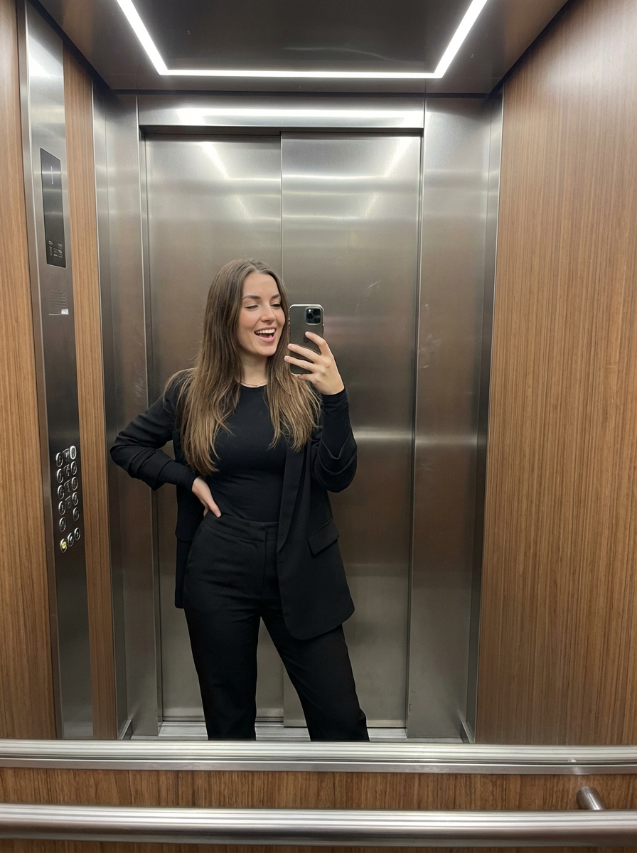 {"image_prompt": {"subject": {"description": "Young model with long, layered brown hair.", "outfit": "Black long-sleeved top or blazer.", "expression": "Genuine, animated smile with mouth slightly open as if mid-sentence or laughing. Eyes looking towards the phone screen/reflection."}, "pose_and_action": {"type": "Mirror selfie.", "details": "Standing pose, holding a smartphone aloft in one hand to capture reflection. Opposite hand resting casually on hip. Head tilted slightly in a relaxed manner."}, "environment": {"location": "Modern elevator interior.", "elements": "Brushed stainless steel walls and doors, subtle wood paneling accents, elevator button panel with illuminated buttons.", "reflections": "Glossy metallic surfaces reflecting the subject and the depth of the confined space."}, "lighting": {"source": "Soft, even overhead LED strip lighting.", "quality": "Flattering, diffuse light with subtle highlights on hair and skin. Cool tones from the metal contrasting with warm skin tones."}, "technical_style": {"aesthetic": "Photorealistic, candid, cinematic, high resolution, 8k.", "vibe": "Spontaneous, intimate, social media snapshot style."}}, "full_combined_prompt": "A photorealistic mirror selfie of a young model with long brown hair inside a modern elevator. She is wearing a black outfit, holding a smartphone to take the photo, and resting one hand on her hip. She has a genuine, animated smile with her mouth slightly open as if speaking. The background features brushed stainless steel panels, metal doors, and elevator buttons. The lighting is soft and overhead, creating reflections on the metallic surfaces. The vibe is candid and spontaneous. High detail, 8k resolution."}