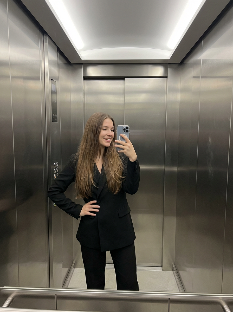 {"image_prompt": {"subject": {"description": "Young model with long, layered brown hair.", "outfit": "Black long-sleeved top or blazer.", "expression": "Genuine, animated smile with mouth slightly open as if mid-sentence or laughing. Eyes looking towards the phone screen/reflection."}, "pose_and_action": {"type": "Mirror selfie.", "details": "Standing pose, holding a smartphone aloft in one hand to capture reflection. Opposite hand resting casually on hip. Head tilted slightly in a relaxed manner."}, "environment": {"location": "Modern elevator interior.", "elements": "Brushed stainless steel walls and doors, subtle wood paneling accents, elevator button panel with illuminated buttons.", "reflections": "Glossy metallic surfaces reflecting the subject and the depth of the confined space."}, "lighting": {"source": "Soft, even overhead LED strip lighting.", "quality": "Flattering, diffuse light with subtle highlights on hair and skin. Cool tones from the metal contrasting with warm skin tones."}, "technical_style": {"aesthetic": "Photorealistic, candid, cinematic, high resolution, 8k.", "vibe": "Spontaneous, intimate, social media snapshot style."}}, "full_combined_prompt": "A photorealistic mirror selfie of a young model with long brown hair inside a modern elevator. She is wearing a black outfit, holding a smartphone to take the photo, and resting one hand on her hip. She has a genuine, animated smile with her mouth slightly open as if speaking. The background features brushed stainless steel panels, metal doors, and elevator buttons. The lighting is soft and overhead, creating reflections on the metallic surfaces. The vibe is candid and spontaneous. High detail, 8k resolution."}