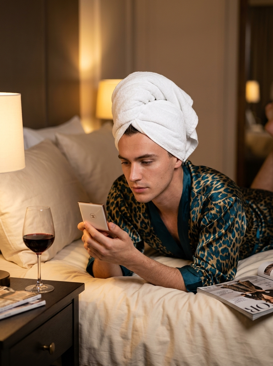 {"image_prompt":{"reference":{"face_identity":"uploaded reference image","identity_lock":true,"face_preservation":"100% identical facial structure, proportions, eye shape, lips, nose, brows, skin texture, moles, and expression"},"subject":{"type":"young male model","expression":"focused, elegant, softly sophisticated","gaze":"looking slightly downward at a handheld mirror","pose":{"position":"lying comfortably on his stomach on a bed","arms":"bent at the elbows, one hand holding a compact mirror, the other grooming natural features","posture":"relaxed, , cinematic"}},"hair":{"style":"hair fully wrapped in a towel turban","visibility":"no loose hair "},"makeup":{"style":"natural groomed","details":["defined brows","soft contour","clean skin","natural lashes","light stubble"]},"outfit":{"clothing":"luxurious patterned robe with animal-print design","fabric":"silky, soft, flowing texture"},"environment":{"location":"elegant bedroom","background_elements":["soft neutral bedding","warm bedside lamp","glass of wine on side table","fashion magazines on the bed"],"ambience":" , cinematic, vintage glamour"},"lighting":{"type":"warm cinematic indoor lighting","characteristics":["golden highlights on skin","soft shadows","moody evening tones","luxurious hotel-style atmosphere"]},"photography_style":{"style":"editorial lifestyle portrait","camera_look":"DSLR cinematic photography","depth_of_field":"shallow depth of field with soft background blur","mood":"sensual, elegant, contemplative"},"render_quality":{"realism":"highly photorealistic","detail_level":"ultra high","skin_texture":"natural and realistic","resolution":"8K","color_grading":"warm, cinematic tones"},"constraints":{"text_in_image":"none","background_text":"removed","style_integrity":"maintain realism, no cartoon or illustration effects"}}}