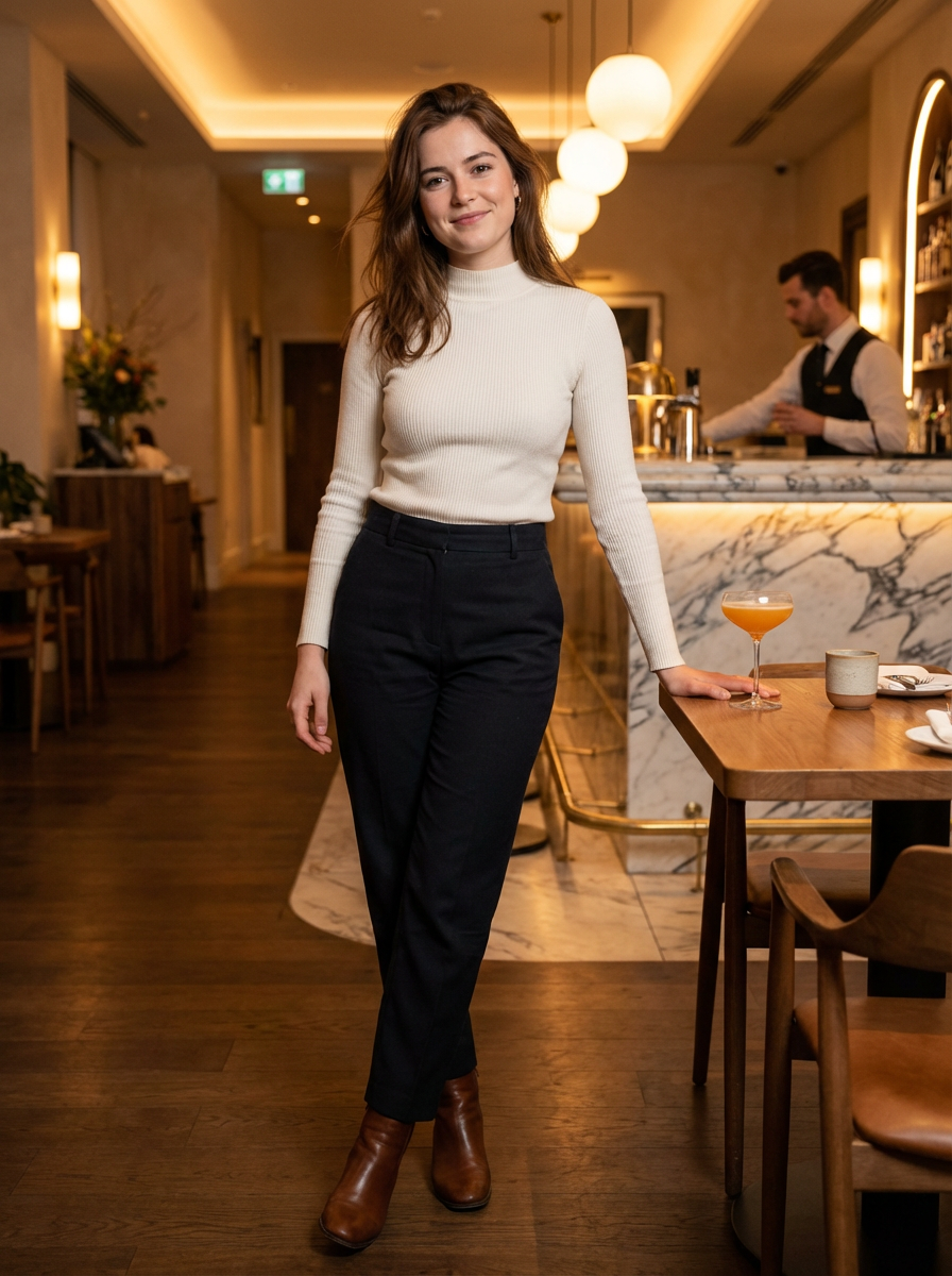{"image_prompt":{"subject":{"description":"Beautiful young model in her mid-20s with a relaxed, flirty expression","hair":"Long, straight chestnut-brown hair with subtle natural highlights, slightly tousled, falling naturally over shoulders","face":"Flawless fair skin with a soft warm glow, subtle natural makeup, gentle serene smile, delicate nose and full lips","gaze":"Eyes softly shut or looking slightly downward, giving a calm, introspective, blissful vibe"},"clothing":{"top":"Fitted cream-white ribbed long-sleeve turtleneck or crew-neck top, luxurious soft fabric","style":"Minimalist chic, elegant yet cozy"},"accessories":{"jewelry":"Thin silver ring on the ring finger of the hand supporting her face","nails":"Clean, short, natural or barely-there nude polish"},"props":{"primary":"Elegant coupe glass with a pinkish-orange cocktail (likely an aperitif or aperol spritz) placed directly in front of her on the table","secondary":"Small white ceramic cup with delicate blue floral pattern (coffee/tea) to her right, tiny vase with baby's breath and greenery"},"pose":"Elbow on wooden table, head gently resting on left hand, fingers lightly touching cheek, body slightly turned toward camera, extremely relaxed and content posture","background":{"setting":"Upscale modern restaurant/bar with warm sophisticated ambiance","foreground_table":"Warm wooden tabletop with visible grain","midground":"Curved glowing marble bar counter lined with upside-down wine glasses and premium bottles","people":"Bearded male bartender in white chef shirt and dark green apron shaking a cocktail in the background, slightly out of focus","architecture":"Elegant ceiling with ornate molding, recessed warm spotlights, soft cream walls, arched alcoves","ambience":"Evening, intimate, luxurious, cozy golden-hour indoor feel"},"lighting":{"type":"Warm, soft artificial lighting","source":"Multiple recessed ceiling lights + subtle under-bar glow","color_temperature":"Around 2700-3000K, very warm and inviting","shadows":"Gentle soft shadows under chin and nose, beautiful rim light on hair"},"camera_style":{"shot_type":"Medium close-up portrait, slightly above eye level","lens_details":"50mm or 85mm prime lens","aperture":"f/1.8 – f/2.2 for creamy bokeh and perfect subject separation","iso":"ISO 400-800, clean with subtle natural grain","shutter_speed":"1/100s","focus":"Pin-sharp on eyes/lashes and face, dreamy fall-off to background","color_grading":"Warm film-like tones, soft highlights, rich mids, slight teal shadows"}}}