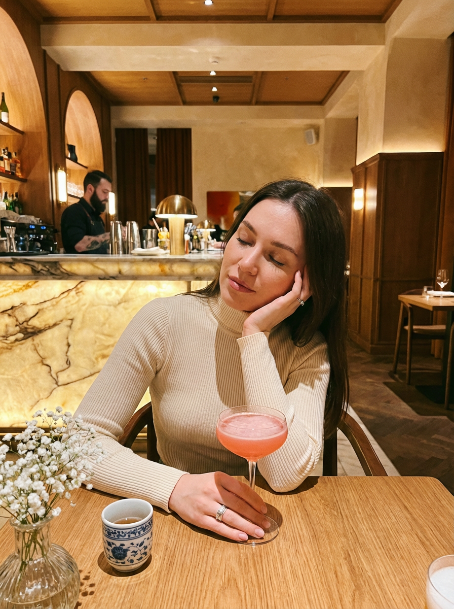 {"image_prompt":{"subject":{"description":"Beautiful young model in her mid-20s with a relaxed, flirty expression","hair":"Long, straight chestnut-brown hair with subtle natural highlights, slightly tousled, falling naturally over shoulders","face":"Flawless fair skin with a soft warm glow, subtle natural makeup, gentle serene smile, delicate nose and full lips","gaze":"Eyes softly shut or looking slightly downward, giving a calm, introspective, blissful vibe"},"clothing":{"top":"Fitted cream-white ribbed long-sleeve turtleneck or crew-neck top, luxurious soft fabric","style":"Minimalist chic, elegant yet cozy"},"accessories":{"jewelry":"Thin silver ring on the ring finger of the hand supporting her face","nails":"Clean, short, natural or barely-there nude polish"},"props":{"primary":"Elegant coupe glass with a pinkish-orange cocktail (likely an aperitif or aperol spritz) placed directly in front of her on the table","secondary":"Small white ceramic cup with delicate blue floral pattern (coffee/tea) to her right, tiny vase with baby's breath and greenery"},"pose":"Elbow on wooden table, head gently resting on left hand, fingers lightly touching cheek, body slightly turned toward camera, extremely relaxed and content posture","background":{"setting":"Upscale modern restaurant/bar with warm sophisticated ambiance","foreground_table":"Warm wooden tabletop with visible grain","midground":"Curved glowing marble bar counter lined with upside-down wine glasses and premium bottles","people":"Bearded male bartender in white chef shirt and dark green apron shaking a cocktail in the background, slightly out of focus","architecture":"Elegant ceiling with ornate molding, recessed warm spotlights, soft cream walls, arched alcoves","ambience":"Evening, intimate, luxurious, cozy golden-hour indoor feel"},"lighting":{"type":"Warm, soft artificial lighting","source":"Multiple recessed ceiling lights + subtle under-bar glow","color_temperature":"Around 2700-3000K, very warm and inviting","shadows":"Gentle soft shadows under chin and nose, beautiful rim light on hair"},"camera_style":{"shot_type":"Medium close-up portrait, slightly above eye level","lens_details":"50mm or 85mm prime lens","aperture":"f/1.8 – f/2.2 for creamy bokeh and perfect subject separation","iso":"ISO 400-800, clean with subtle natural grain","shutter_speed":"1/100s","focus":"Pin-sharp on eyes/lashes and face, dreamy fall-off to background","color_grading":"Warm film-like tones, soft highlights, rich mids, slight teal shadows"}}}