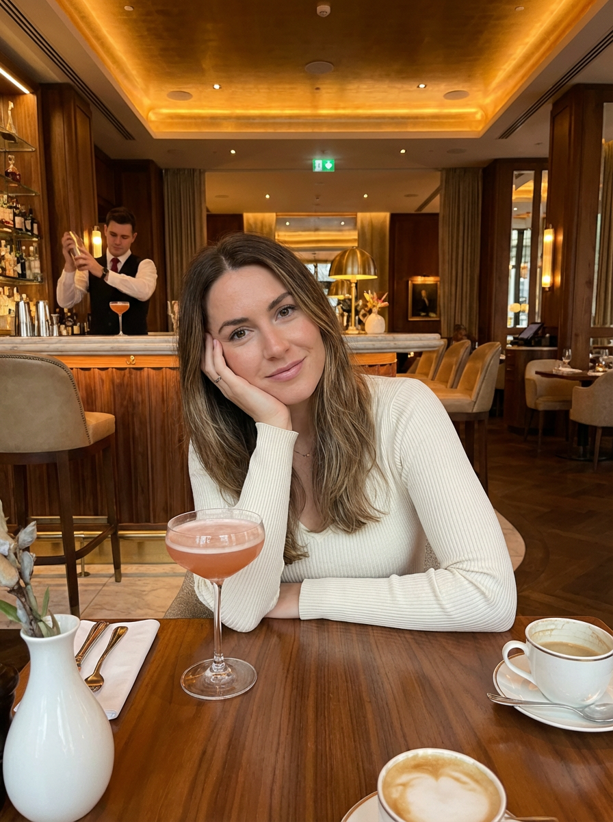 {"image_prompt":{"subject":{"description":"Beautiful young model in her mid-20s with a relaxed, flirty expression","hair":"Long, straight chestnut-brown hair with subtle natural highlights, slightly tousled, falling naturally over shoulders","face":"Flawless fair skin with a soft warm glow, subtle natural makeup, gentle serene smile, delicate nose and full lips","gaze":"Eyes softly shut or looking slightly downward, giving a calm, introspective, blissful vibe"},"clothing":{"top":"Fitted cream-white ribbed long-sleeve turtleneck or crew-neck top, luxurious soft fabric","style":"Minimalist chic, elegant yet cozy"},"accessories":{"jewelry":"Thin silver ring on the ring finger of the hand supporting her face","nails":"Clean, short, natural or barely-there nude polish"},"props":{"primary":"Elegant coupe glass with a pinkish-orange cocktail (likely an aperitif or aperol spritz) placed directly in front of her on the table","secondary":"Small white ceramic cup with delicate blue floral pattern (coffee/tea) to her right, tiny vase with baby's breath and greenery"},"pose":"Elbow on wooden table, head gently resting on left hand, fingers lightly touching cheek, body slightly turned toward camera, extremely relaxed and content posture","background":{"setting":"Upscale modern restaurant/bar with warm sophisticated ambiance","foreground_table":"Warm wooden tabletop with visible grain","midground":"Curved glowing marble bar counter lined with upside-down wine glasses and premium bottles","people":"Bearded male bartender in white chef shirt and dark green apron shaking a cocktail in the background, slightly out of focus","architecture":"Elegant ceiling with ornate molding, recessed warm spotlights, soft cream walls, arched alcoves","ambience":"Evening, intimate, luxurious, cozy golden-hour indoor feel"},"lighting":{"type":"Warm, soft artificial lighting","source":"Multiple recessed ceiling lights + subtle under-bar glow","color_temperature":"Around 2700-3000K, very warm and inviting","shadows":"Gentle soft shadows under chin and nose, beautiful rim light on hair"},"camera_style":{"shot_type":"Medium close-up portrait, slightly above eye level","lens_details":"50mm or 85mm prime lens","aperture":"f/1.8 – f/2.2 for creamy bokeh and perfect subject separation","iso":"ISO 400-800, clean with subtle natural grain","shutter_speed":"1/100s","focus":"Pin-sharp on eyes/lashes and face, dreamy fall-off to background","color_grading":"Warm film-like tones, soft highlights, rich mids, slight teal shadows"}}}