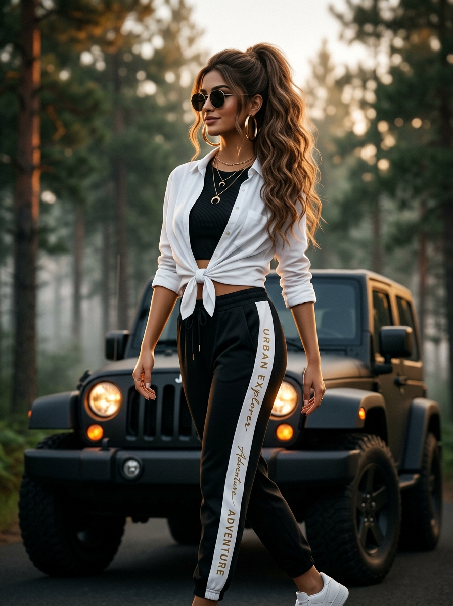{"image_prompt":{"subject":{"description":"Hyper-realistic full-body portrait of a fashionable young South with a confident, sultry presence","pose":"Stylish side posture with her body angled 45 degrees away from the camera, head slightly turned over her shoulder, chin subtly raised, eyes looking off-frame for a candid high-fashion feel","expression":"Relaxed, confident, and alluring with a soft, effortless smirk","hair":"Long, wavy, voluminous brown hair tied in a high ponytail with loose strands framing the face, gently flowing","accessories":["Round dark luxury sunglasses","Layered gold necklaces with crescent moon pendants","Large polished gold if(gender=f){hoop earrings } "],"outfit":{"top":"button-down shirt tied at the waist over a fitted crop top ","bottom":"athletic joggers with a bold side stripe and elegant script detailing","style":"Urban chic meets high-fashion streetwear"}},"environment":{"vehicle":"Matte off-road Jeep positioned slightly behind the subject at an angle","lighting_effects":"Jeep\u2019s round headlights glowing in warm amber tones creating soft cinematic bokeh","background":"Misty pine forest with layered depth, fog rolling between tall trees, enhanced atmospheric perspective","time_of_day":"Golden hour at sunset with warm highlights and cool forest shadows"},"mood_and_style":{"overall_vibe":"Bold, confident, effortlessly hot, editorial fashion aesthetic","color_palette":"Warm amber highlights contrasted with deep forest greens and matte blacks","fashion_inspiration":"Luxury outdoor editorial, Instagram model aesthetic, cinematic lifestyle photography"},"technical_specifications":{"aspect_ratio":"9:16","resolution":"8K ultra-high resolution","format":"PNG","camera":"35mm lens","focus":"Sharp focus on subject with creamy background depth-of-field","lighting":"Cinematic golden-hour rim lighting with soft fill light on the face","texture_detail":"Hyper-detailed skin, fabric, jewelry, and vehicle textures","composition":"Centered subject at eye level with dynamic negative space"},"render_quality":{"realism":"Ultra photorealistic","post_processing":"Subtle film grain, high dynamic range, professional color grading","style":"High-end fashion photography, cinematic realism"}}}