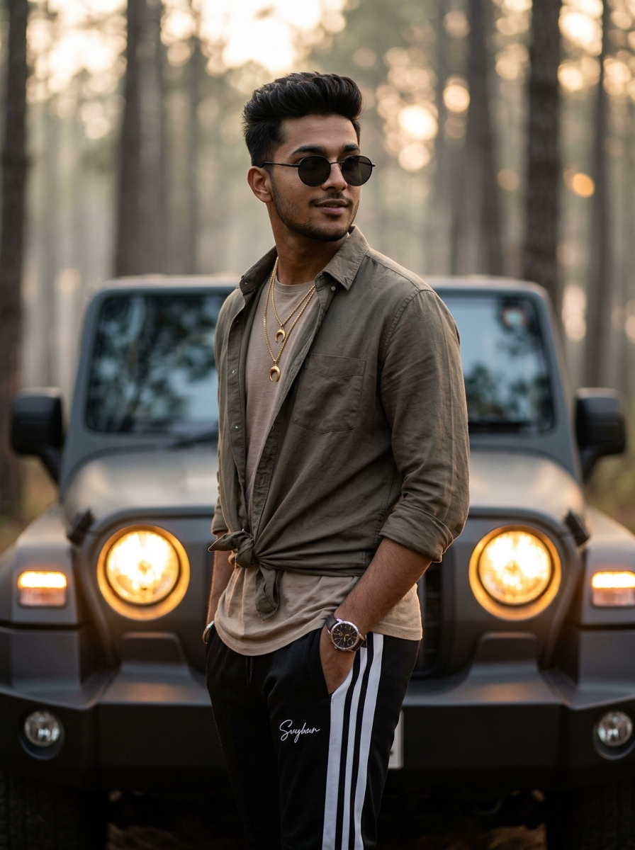 {"image_prompt":{"subject":{"description":"Hyper-realistic full-body portrait of a fashionable young South Asian model with a confident, intense presence","pose":"Stylish side posture with his body angled 45 degrees away from the camera, head slightly turned over his shoulder, chin subtly raised, eyes looking off-frame for a candid high-fashion feel","expression":"Relaxed, confident, and magnetic with a soft, effortless smirk","hair":"Short, wavy, voluminous brown styled hair with loose strands framing the face, textured and tousled","accessories":["Round dark luxury sunglasses","Layered gold chain necklaces with crescent moon pendants","Polished wristwatch"],"outfit":{"top":"button-down shirt tied at the waist over a fitted t-shirt","bottom":"athletic joggers with a bold side stripe and elegant script detailing","style":"Urban chic meets high-fashion streetwear"}},"environment":{"vehicle":"Matte off-road Jeep positioned slightly behind the subject at an angle","lighting_effects":"Jeep\u2019s round headlights glowing in warm amber tones creating soft cinematic bokeh","background":"Misty pine forest with layered depth, fog rolling between tall trees, enhanced atmospheric perspective","time_of_day":"Golden hour at sunset with warm highlights and cool forest shadows"},"mood_and_style":{"overall_vibe":"Bold, confident, effortlessly hot, editorial fashion aesthetic","color_palette":"Warm amber highlights contrasted with deep forest greens and matte blacks","fashion_inspiration":"Luxury outdoor editorial, Instagram model aesthetic, cinematic lifestyle photography"},"technical_specifications":{"aspect_ratio":"9:16","resolution":"8K ultra-high resolution","format":"PNG","camera":"35mm lens","focus":"Sharp focus on subject with creamy background depth-of-field","lighting":"Cinematic golden-hour rim lighting with soft fill light on the face","texture_detail":"Hyper-detailed skin, fabric, jewelry, and vehicle textures","composition":"Centered subject at eye level with dynamic negative space"},"render_quality":{"realism":"Ultra photorealistic","post_processing":"Subtle film grain, high dynamic range, professional color grading","style":"High-end fashion photography, cinematic realism"}}}