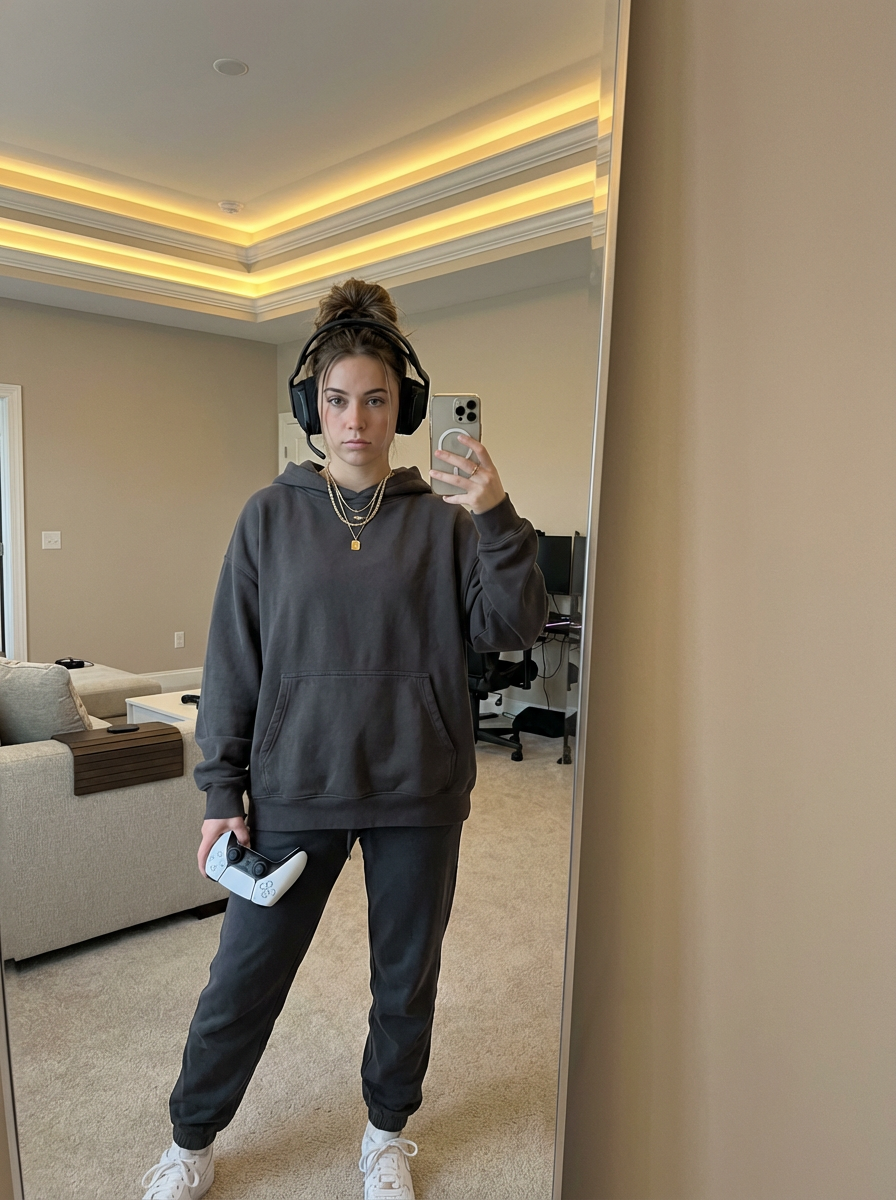 {"image_prompt":{"subject":{"description":"Young model with a casual, authentic appearance","hair":"Messy blonde hair tied back in a loose bun or ponytail with stray strands framing the face","face":"Natural skin texture with visible freckles, hazel-green eyes, soft pink lips, neutral to slightly pouty expression","gaze":"Direct eye contact with the camera"},"clothing":{"top":"Oversized charcoal grey hoodie","style":"Casual loungewear / gaming attire"},"accessories":{"headwear":"Large black over-ear gaming headset with an attached boom microphone positioned near the cheek","jewelry":"Layered gold necklaces, including a shorter chain and a longer chain with a round coin pendant","hands":"White manicured nails"},"props":{"primary":"White PlayStation 5 DualSense controller held up close to the face, partially covering the chin and cheek"},"background":{"setting":"Modern interior room","ceiling":"Tray ceiling architecture with warm recessed LED strip lighting and two visible pot lights","walls":"Plain beige or cream-colored walls","ambience":"Cozy, domestic evening setting"},"lighting":{"type":"Warm artificial indoor lighting","source":"Overhead recessed ceiling lights creating a soft glow","shadows":"Soft shadows under the chin and around the eyes due to overhead lighting"},"camera_style":{"shot_type":"Selfie-style portrait, medium close-up","lens_details":"35mm prime lens with natural perspective","aperture":"f/2.0 for shallow depth of field and soft background bokeh","iso":"ISO 800 for realistic indoor low-light grain","shutter_speed":"1/60s to capture natural movement","file_format":"RAW, with subtle film simulation processing","focus":"Sharp focus on the eyes and freckles, with soft blur on the background"}}}