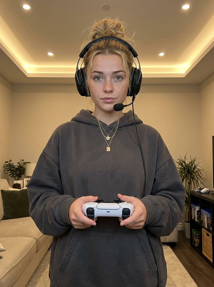{"image_prompt":{"subject":{"description":"Young model with a casual, authentic appearance","hair":"Messy blonde hair tied back in a loose bun or ponytail with stray strands framing the face","face":"Natural skin texture with visible freckles, hazel-green eyes, soft pink lips, neutral to slightly pouty expression","gaze":"Direct eye contact with the camera"},"clothing":{"top":"Oversized charcoal grey hoodie","style":"Casual loungewear / gaming attire"},"accessories":{"headwear":"Large black over-ear gaming headset with an attached boom microphone positioned near the cheek","jewelry":"Layered gold necklaces, including a shorter chain and a longer chain with a round coin pendant","hands":"White manicured nails"},"props":{"primary":"White PlayStation 5 DualSense controller held up close to the face, partially covering the chin and cheek"},"background":{"setting":"Modern interior room","ceiling":"Tray ceiling architecture with warm recessed LED strip lighting and two visible pot lights","walls":"Plain beige or cream-colored walls","ambience":"Cozy, domestic evening setting"},"lighting":{"type":"Warm artificial indoor lighting","source":"Overhead recessed ceiling lights creating a soft glow","shadows":"Soft shadows under the chin and around the eyes due to overhead lighting"},"camera_style":{"shot_type":"Selfie-style portrait, medium close-up","lens_details":"35mm prime lens with natural perspective","aperture":"f/2.0 for shallow depth of field and soft background bokeh","iso":"ISO 800 for realistic indoor low-light grain","shutter_speed":"1/60s to capture natural movement","file_format":"RAW, with subtle film simulation processing","focus":"Sharp focus on the eyes and freckles, with soft blur on the background"}}}
