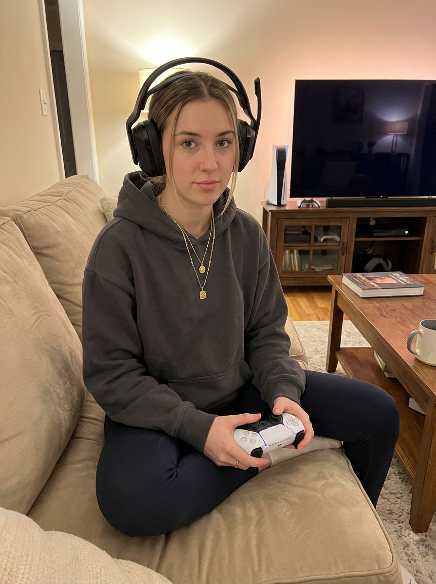 {"image_prompt":{"subject":{"description":"Young model with a casual, authentic appearance","hair":"Messy blonde hair tied back in a loose bun or ponytail with stray strands framing the face","face":"Natural skin texture with visible freckles, hazel-green eyes, soft pink lips, neutral to slightly pouty expression","gaze":"Direct eye contact with the camera"},"clothing":{"top":"Oversized charcoal grey hoodie","style":"Casual loungewear / gaming attire"},"accessories":{"headwear":"Large black over-ear gaming headset with an attached boom microphone positioned near the cheek","jewelry":"Layered gold necklaces, including a shorter chain and a longer chain with a round coin pendant","hands":"White manicured nails"},"props":{"primary":"White PlayStation 5 DualSense controller held up close to the face, partially covering the chin and cheek"},"background":{"setting":"Modern interior room","ceiling":"Tray ceiling architecture with warm recessed LED strip lighting and two visible pot lights","walls":"Plain beige or cream-colored walls","ambience":"Cozy, domestic evening setting"},"lighting":{"type":"Warm artificial indoor lighting","source":"Overhead recessed ceiling lights creating a soft glow","shadows":"Soft shadows under the chin and around the eyes due to overhead lighting"},"camera_style":{"shot_type":"Selfie-style portrait, medium close-up","lens_details":"35mm prime lens with natural perspective","aperture":"f/2.0 for shallow depth of field and soft background bokeh","iso":"ISO 800 for realistic indoor low-light grain","shutter_speed":"1/60s to capture natural movement","file_format":"RAW, with subtle film simulation processing","focus":"Sharp focus on the eyes and freckles, with soft blur on the background"}}}