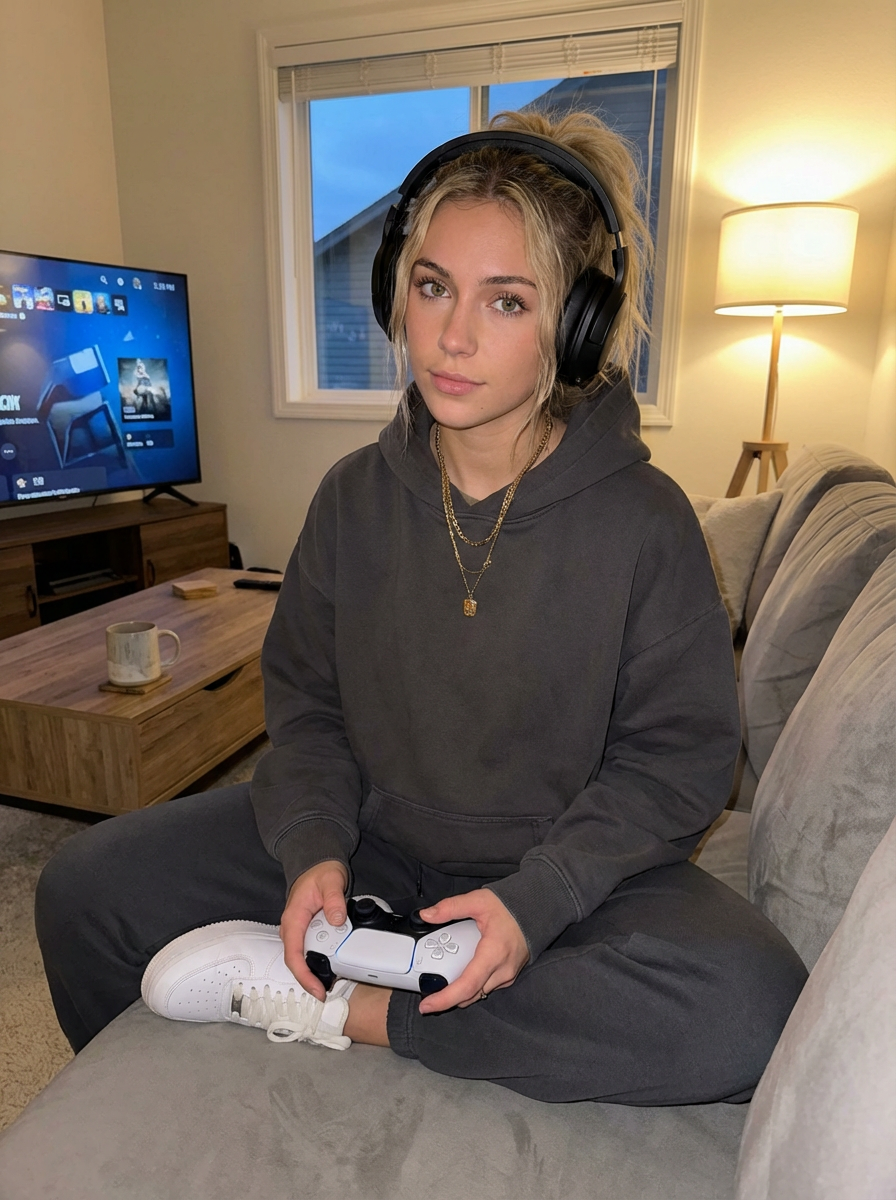 {"image_prompt":{"subject":{"description":"Young model with a casual, authentic appearance","hair":"Messy blonde hair tied back in a loose bun or ponytail with stray strands framing the face","face":"Natural skin texture with visible freckles, hazel-green eyes, soft pink lips, neutral to slightly pouty expression","gaze":"Direct eye contact with the camera"},"clothing":{"top":"Oversized charcoal grey hoodie","style":"Casual loungewear / gaming attire"},"accessories":{"headwear":"Large black over-ear gaming headset with an attached boom microphone positioned near the cheek","jewelry":"Layered gold necklaces, including a shorter chain and a longer chain with a round coin pendant","hands":"White manicured nails"},"props":{"primary":"White PlayStation 5 DualSense controller held up close to the face, partially covering the chin and cheek"},"background":{"setting":"Modern interior room","ceiling":"Tray ceiling architecture with warm recessed LED strip lighting and two visible pot lights","walls":"Plain beige or cream-colored walls","ambience":"Cozy, domestic evening setting"},"lighting":{"type":"Warm artificial indoor lighting","source":"Overhead recessed ceiling lights creating a soft glow","shadows":"Soft shadows under the chin and around the eyes due to overhead lighting"},"camera_style":{"shot_type":"Selfie-style portrait, medium close-up","lens_details":"35mm prime lens with natural perspective","aperture":"f/2.0 for shallow depth of field and soft background bokeh","iso":"ISO 800 for realistic indoor low-light grain","shutter_speed":"1/60s to capture natural movement","file_format":"RAW, with subtle film simulation processing","focus":"Sharp focus on the eyes and freckles, with soft blur on the background"}}}