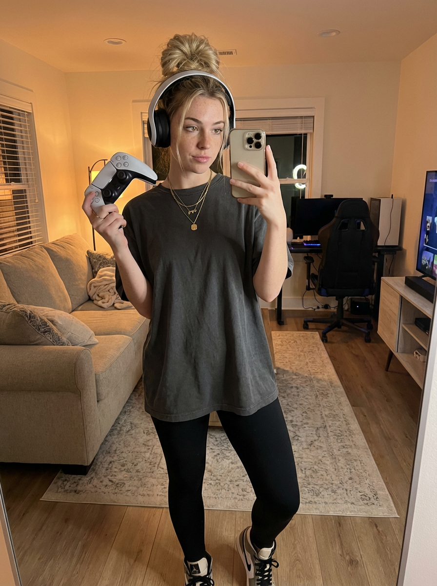 {"image_prompt":{"subject":{"description":"Young model with a casual, authentic appearance","hair":"Messy blonde hair tied back in a loose bun or ponytail with stray strands framing the face","face":"Natural skin texture with visible freckles, hazel-green eyes, soft pink lips, neutral to slightly pouty expression","gaze":"Direct eye contact with the camera"},"clothing":{"top":"Oversized charcoal grey hoodie","style":"Casual loungewear / gaming attire"},"accessories":{"headwear":"Large black over-ear gaming headset with an attached boom microphone positioned near the cheek","jewelry":"Layered gold necklaces, including a shorter chain and a longer chain with a round coin pendant","hands":"White manicured nails"},"props":{"primary":"White PlayStation 5 DualSense controller held up close to the face, partially covering the chin and cheek"},"background":{"setting":"Modern interior room","ceiling":"Tray ceiling architecture with warm recessed LED strip lighting and two visible pot lights","walls":"Plain beige or cream-colored walls","ambience":"Cozy, domestic evening setting"},"lighting":{"type":"Warm artificial indoor lighting","source":"Overhead recessed ceiling lights creating a soft glow","shadows":"Soft shadows under the chin and around the eyes due to overhead lighting"},"camera_style":{"shot_type":"Selfie-style portrait, medium close-up","lens_details":"35mm prime lens with natural perspective","aperture":"f/2.0 for shallow depth of field and soft background bokeh","iso":"ISO 800 for realistic indoor low-light grain","shutter_speed":"1/60s to capture natural movement","file_format":"RAW, with subtle film simulation processing","focus":"Sharp focus on the eyes and freckles, with soft blur on the background"}}}