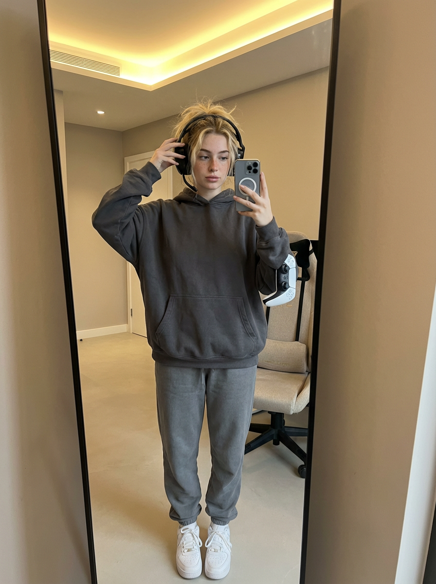 {"image_prompt":{"subject":{"description":"Young model with a casual, authentic appearance","hair":"Messy blonde hair tied back in a loose bun or ponytail with stray strands framing the face","face":"Natural skin texture with visible freckles, hazel-green eyes, soft pink lips, neutral to slightly pouty expression","gaze":"Direct eye contact with the camera"},"clothing":{"top":"Oversized charcoal grey hoodie","style":"Casual loungewear / gaming attire"},"accessories":{"headwear":"Large black over-ear gaming headset with an attached boom microphone positioned near the cheek","jewelry":"Layered gold necklaces, including a shorter chain and a longer chain with a round coin pendant","hands":"White manicured nails"},"props":{"primary":"White PlayStation 5 DualSense controller held up close to the face, partially covering the chin and cheek"},"background":{"setting":"Modern interior room","ceiling":"Tray ceiling architecture with warm recessed LED strip lighting and two visible pot lights","walls":"Plain beige or cream-colored walls","ambience":"Cozy, domestic evening setting"},"lighting":{"type":"Warm artificial indoor lighting","source":"Overhead recessed ceiling lights creating a soft glow","shadows":"Soft shadows under the chin and around the eyes due to overhead lighting"},"camera_style":{"shot_type":"Selfie-style portrait, medium close-up","lens_details":"35mm prime lens with natural perspective","aperture":"f/2.0 for shallow depth of field and soft background bokeh","iso":"ISO 800 for realistic indoor low-light grain","shutter_speed":"1/60s to capture natural movement","file_format":"RAW, with subtle film simulation processing","focus":"Sharp focus on the eyes and freckles, with soft blur on the background"}}}