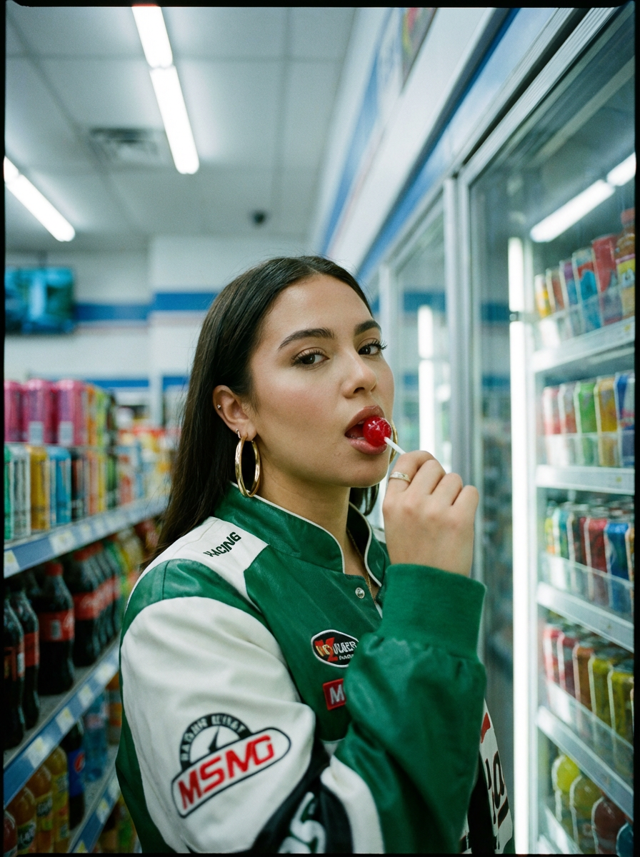 {"image_prompt":{"subject":{"face_preservation":true,"description":"young model posing inside a convenience store in a moody cinematic setting","appearance":{"hair":{"style":"90s-style up-do with volume and loose face-framing strands"},"accessories":["large gold hoop earrings"],"makeup":{"lashes":"bold long lashes","blush":"soft warm blush on cheeks","lips":"natural gloss tone"},"props":{"item_in_hand":"red lollipop held up to her mouth"},"outfit":{"jacket":{"type":"bold racing-style jacket","colors":["white","green"],"details":"multiple patches and logos, Y2K streetwear aesthetic"}}},"pose":{"expression":"confident, carefree, slightly rebellious","body_language":"relaxed yet bold stance","interaction":"holding lollipop near mouth, looking directly at camera"}},"environment":{"setting":"interior of a convenience store","background":{"main_elements":["refrigerated drink shelves","colorful bottles and cans behind subject"],"depth":"shallow depth of field—subject sharp, background softly blurred"},"lighting":{"type":"cool-toned fluorescent store lighting","effect":"cinematic overhead glow with subtle shadows"},"atmosphere":{"mood":"urban, edgy, nostalgic, cinematic","texture":"35mm film grain","film_stock":"Kodak Ultramax 400"}},"photography":{"style":"candid yet editorial portrait","camera_type":"35mm film camera","framing":"mid-shot portrait with strong focus on subject, blurred store items","color_tone":"cool, slightly desaturated film tones","quality":"high-resolution film-like realism"},"composition":{"focus":"subject holding the lollipop with strong eye contact","overall_vibe":"Y2K street fashion meets raw documentary style","negative_prompt":["altered face","incorrect facial proportions","wrong hairstyle","missing earrings","incorrect clothing style","no lollipop","overly bright lighting","extra people","distorted shelves","incorrect environment"]}}}