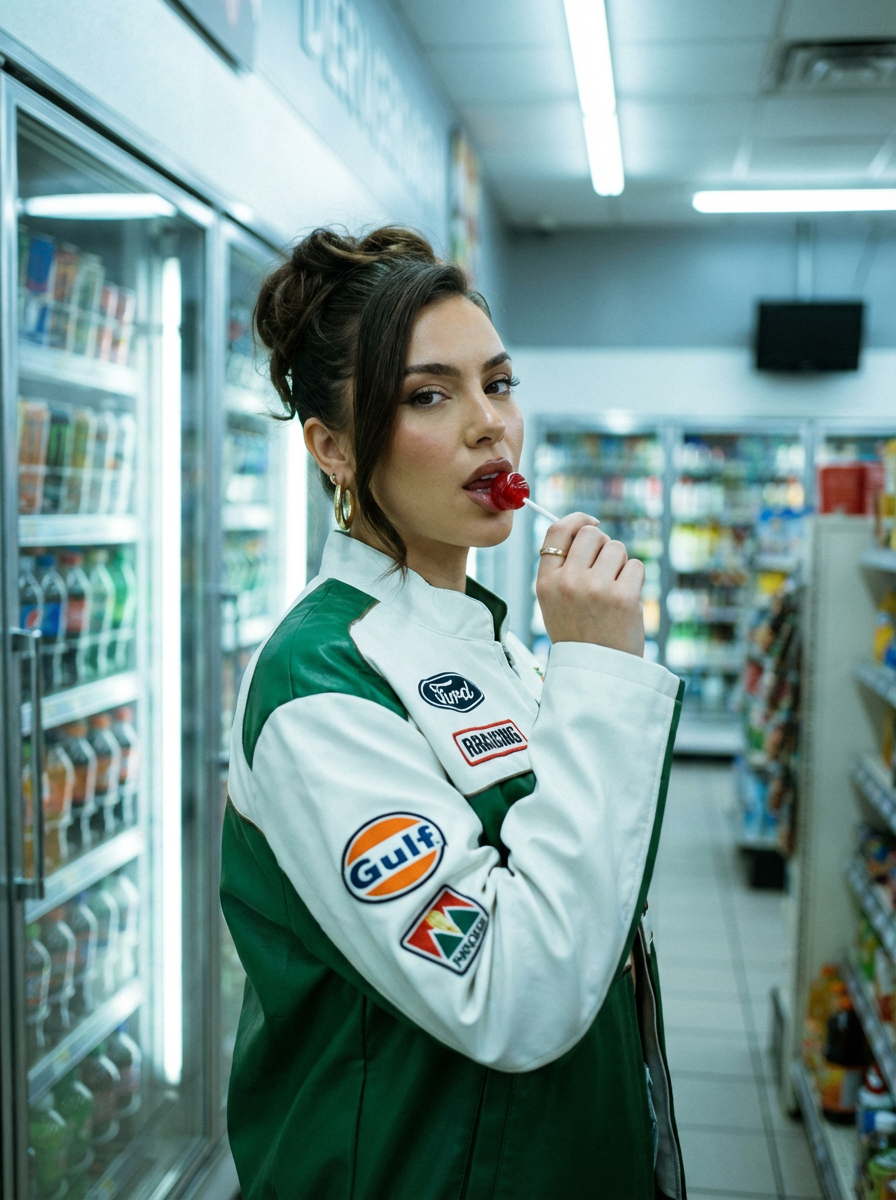 {"image_prompt":{"subject":{"face_preservation":true,"description":"young model posing inside a convenience store in a moody cinematic setting","appearance":{"hair":{"style":"90s-style up-do with volume and loose face-framing strands"},"accessories":["large gold hoop earrings"],"makeup":{"lashes":"bold long lashes","blush":"soft warm blush on cheeks","lips":"natural gloss tone"},"props":{"item_in_hand":"red lollipop held up to her mouth"},"outfit":{"jacket":{"type":"bold racing-style jacket","colors":["white","green"],"details":"multiple patches and logos, Y2K streetwear aesthetic"}}},"pose":{"expression":"confident, carefree, slightly rebellious","body_language":"relaxed yet bold stance","interaction":"holding lollipop near mouth, looking directly at camera"}},"environment":{"setting":"interior of a convenience store","background":{"main_elements":["refrigerated drink shelves","colorful bottles and cans behind subject"],"depth":"shallow depth of field—subject sharp, background softly blurred"},"lighting":{"type":"cool-toned fluorescent store lighting","effect":"cinematic overhead glow with subtle shadows"},"atmosphere":{"mood":"urban, edgy, nostalgic, cinematic","texture":"35mm film grain","film_stock":"Kodak Ultramax 400"}},"photography":{"style":"candid yet editorial portrait","camera_type":"35mm film camera","framing":"mid-shot portrait with strong focus on subject, blurred store items","color_tone":"cool, slightly desaturated film tones","quality":"high-resolution film-like realism"},"composition":{"focus":"subject holding the lollipop with strong eye contact","overall_vibe":"Y2K street fashion meets raw documentary style","negative_prompt":["altered face","incorrect facial proportions","wrong hairstyle","missing earrings","incorrect clothing style","no lollipop","overly bright lighting","extra people","distorted shelves","incorrect environment"]}}}