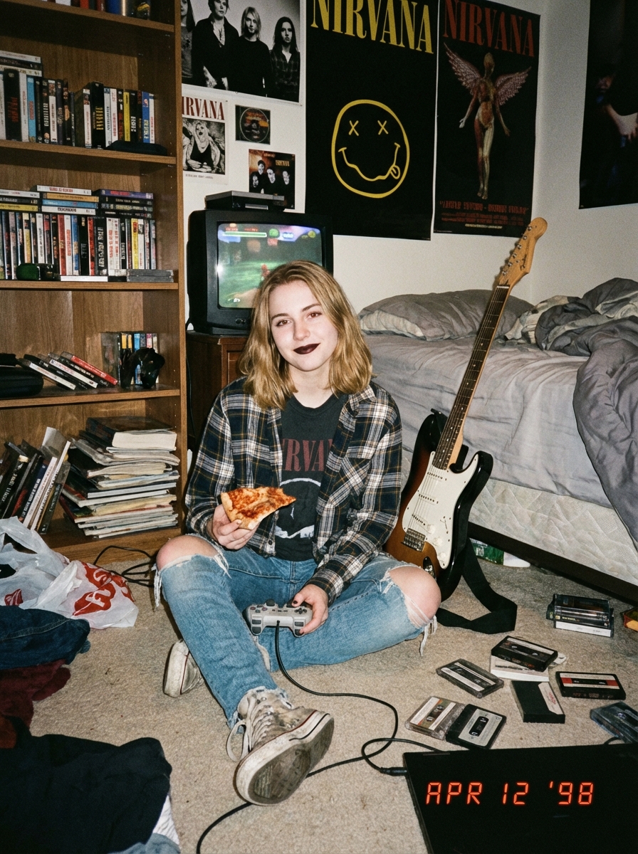 {"image_request": {"goal": "90s Grunge Aesthetic bedroom snapshot, maximalist messy composition, flash photography, featuring a teen rocker in a cluttered room", "meta": {"image_type": "Candid Snapshot / Flash Photography / Grunge Aesthetic / Lifestyle / Period Piece", "quality": "Raw, Authentic, Film Grain, Analog Feel, Detailed Clutter", "color_mode": "Warm Tungsten mixed with harsh flash, slightly faded vintage colors", "style_mode": "retro_analog_candid", "aspect_ratio": "4:5", "resolution": "1440x1920"}, "creative_style": "Teenage angst, Nirvana era grunge, messy maximalism, unpolished authenticity, polaroid aesthetic, disposable camera vibe, rebellious youth culture, intimate chaos", "overall_theme": "teenage rebellion / cozy chaos / nostalgic 90s / music lover / messy lifestyle", "mood_vibe": "rebellious / cozy / lazy / messy / nostalgic / energetic / carefree", "style_keywords": ["90s grunge", "cluttered bedroom", "flash photography", "band posters", "pizza", "flannel shirt", "ripped jeans", "electric guitar", "vintage gaming", "film grain", "analog"], "subject": {"count": "1", "type": "model", "identity": "Cool grunge teenager, hair, attitude", "identity_preservation": {"description": "Preserve the 'too cool to care' attitude and candid expression", "notes": "Looks like a friend took the photo."}, "age_appearance": "late teens / 19 years old", "skin": "natural texture, maybe slight imperfections, pale", "makeup": {"lips": "dark berry or brown lipstick (90s style)", "eyes": "smudged eyeliner", "general": "messy, lived-in make-up.p"}, "facial_features": {"expression": "laughing mid-sentence or bored chewing gum", "eyes": {"gaze": "looking at the camera or distracted by a game", "intensity": "playful or bored"}, "lips": {"gesture": "chewing gum, bubbling, or smiling"}}, "hair": {"length": "shoulder length, messy shag cut", "texture": "bleached, slightly frizzy, dyed pink or green tips", "style": "bedhead, unkempt", "lighting_interaction": {"light": "flash reflection on oily roots", "shadow_play": "harsh shadow behind head"}}, "clothing": {"top": "oversized vintage band t-shirt (e.g., Nirvana/Sonic Youth)", "bottom": "light wash ripped baggjeans/fishnetsts underneath", "full_description": "Classic grunge layering: Oversized band tee, flannel shirt tied around waist, ripped jeans, dirty Converse All-Star sneakers", "accessories": "choker necklace, silver rings, chipped nail polish"}, "props": {"guitar": "Fender Stratocaster leaning on bed", "food": "open pizza box on bed", "tech": "Super Nintendo console, CRT TV, scattered cassette tapes", "decor": "Christmas lights, wall covered in magazine cutouts"}}, "pose_action": {"description": "Sitting cross-legged on a messy bed or sprawling on the floor", "overall_pose": "relaxed, slouching, dynamic", "head_turn": "facing camera", "gaze": "direct flash eye contact", "body_position": "slumped comfortably", "hands": "holding a pizza slice or game controller", "movement": "frozen moment candid"}, "multiple_frames_expressions": ["N/A"], "environment": {"setting": "Teenager's Bedroom 1990s", "location": "indoors, small cluttered room", "weather": "indoor night", "time_of_day": "night time hangout", "atmosphere": "stuffy, cozy, smell of teen spirit"}, "background": {"color": "busy multicolored walls", "effect": "cluttered depth, walls covered in posters and collage"}, "lighting": {"type": "On-camera direct flash + ambient warm lamps", "position": "front direct", "direction": "flat flash", "intensity": "harsh foreground, dark corners", "focus": "sharp center", "falloff": "vignette darkness at edges", "light_quality": "hard, artificial, disposable camera look", "source": "camera flash", "tone": "warm ambient vs cool flash", "mood": "fun chaotic night", "subject_lighting": "brightly lit by flash, washed out slightly", "environment_lighting": "warm fairy lights in background", "color_temperature": "mixed", "contrast_shadow": "hard drop shadow behind subject", "shadow_quality": "sharp and distinct", "imperfections": ["red eye effect", "dust particles in flash", "motion blur on hands"]}, "camera": {"sensor_format": "35mm Film Point-and-Shoot (e.g., Olympus Stylus)", "lens": "35mm fixed lens", "position_angle": "slightly high angle (standing friend POV)", "distance": "full body sitting", "framing": "loose framing to show the room clutter", "depth_of_field": "deep depth of field (flash sync), everything mostly in focus", "composition": {"framing": "snapshot style, slightly tilted", "depth": "busy foreground and background", "emphasis": "the chaos of the room and the subject", "angle": "casual snap"}}, "scene_specific_details": {"clutter_level": "MAXIMALIST. Every inch of the frame should have detail (clothes on the floor, open drawers, posters).", "texture_focus": "Paper posters, denim fabric, greasy pizza, fuzzy blankets.", "layout": "Chaotic, no negative space.", "border": "N/A", "tonality_texture": "heavy film grain, Kodak Gold 200 emulation", "highlight_behavior": "flash glare on posters and TV screen"}, "color_grading": {"palette": "Desaturated denim blue, flannel red, warm tungsten yellow, flash white", "lut": "Kodak Gold 200 / Vintage Analog", "mood": "nostalgic grunge"}, "post_processing": {"sharpening": "medium, natural film sharpness", "final_touch": "add dust and scratches overlay, date stamp '98 04 12' in corner"}, "negative": {"style": "clean, modern minimalism, HD digital, studio lighting, soft box, bokeh, 3D render, glossy", "content": "clean room, empty walls, modern smartphone, flatscreen TV, LED strips, luxury furniture", "artifacts": "digital smoothing, plastic skin"}, "additional_controls": {"focus_emphasis": "The authentic feeling of a messy teen bedroom", "grounding": "Subject interacts physically with the mess", "special_notes": "Needs to look like a found photo from 1995. Not a staged photoshoot.", "vibe": "smells like teen spirit", "final_output_goal": "A hyper-authentic 90s flashback image that feels noisy, messy, and real."}}}