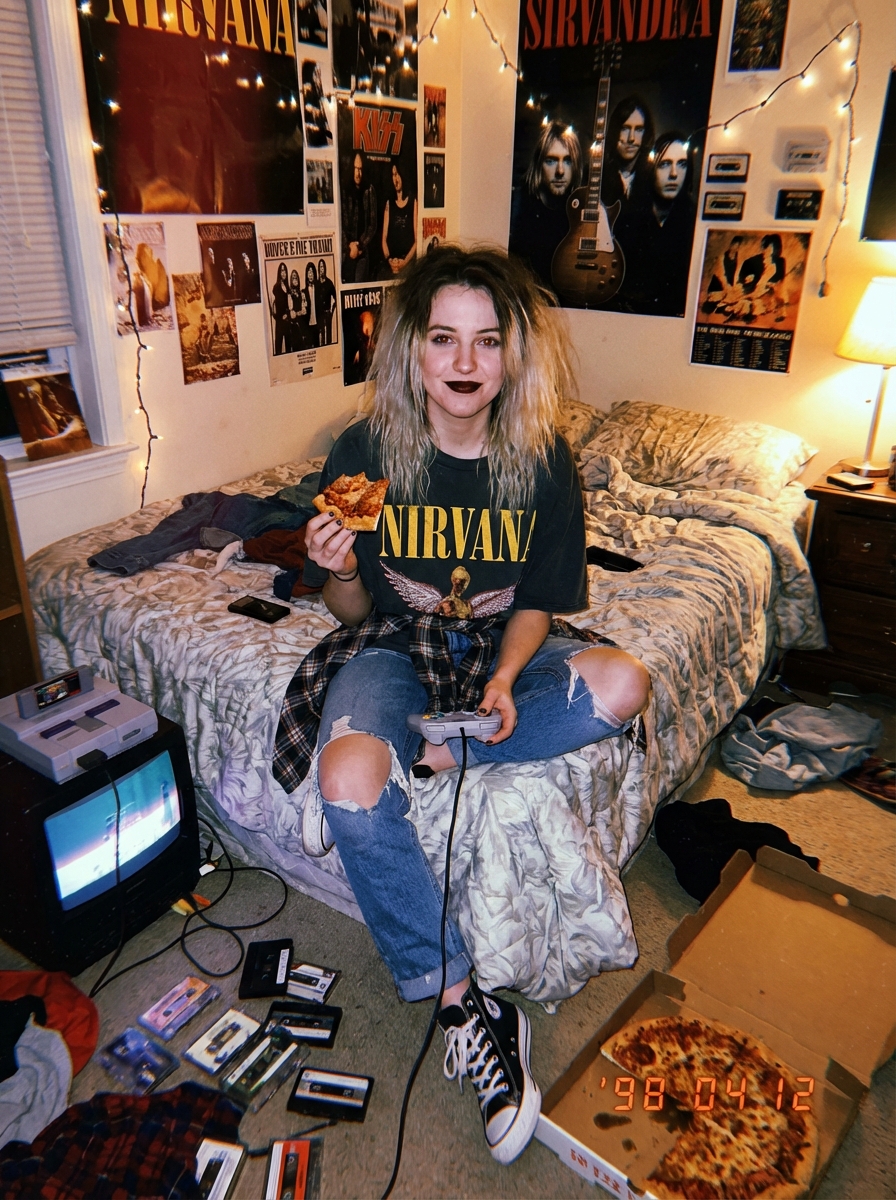 {"image_request": {"goal": "90s Grunge Aesthetic bedroom snapshot, maximalist messy composition, flash photography, featuring a teen rocker in a cluttered room", "meta": {"image_type": "Candid Snapshot / Flash Photography / Grunge Aesthetic / Lifestyle / Period Piece", "quality": "Raw, Authentic, Film Grain, Analog Feel, Detailed Clutter", "color_mode": "Warm Tungsten mixed with harsh flash, slightly faded vintage colors", "style_mode": "retro_analog_candid", "aspect_ratio": "4:5", "resolution": "1440x1920"}, "creative_style": "Teenage angst, Nirvana era grunge, messy maximalism, unpolished authenticity, polaroid aesthetic, disposable camera vibe, rebellious youth culture, intimate chaos", "overall_theme": "teenage rebellion / cozy chaos / nostalgic 90s / music lover / messy lifestyle", "mood_vibe": "rebellious / cozy / lazy / messy / nostalgic / energetic / carefree", "style_keywords": ["90s grunge", "cluttered bedroom", "flash photography", "band posters", "pizza", "flannel shirt", "ripped jeans", "electric guitar", "vintage gaming", "film grain", "analog"], "subject": {"count": "1", "type": "model", "identity": "Cool grunge teenager, hair, attitude", "identity_preservation": {"description": "Preserve the 'too cool to care' attitude and candid expression", "notes": "Looks like a friend took the photo."}, "age_appearance": "late teens / 19 years old", "skin": "natural texture, maybe slight imperfections, pale", "makeup": {"lips": "dark berry or brown lipstick (90s style)", "eyes": "smudged eyeliner", "general": "messy, lived-in make-up.p"}, "facial_features": {"expression": "laughing mid-sentence or bored chewing gum", "eyes": {"gaze": "looking at the camera or distracted by a game", "intensity": "playful or bored"}, "lips": {"gesture": "chewing gum, bubbling, or smiling"}}, "hair": {"length": "shoulder length, messy shag cut", "texture": "bleached, slightly frizzy, dyed pink or green tips", "style": "bedhead, unkempt", "lighting_interaction": {"light": "flash reflection on oily roots", "shadow_play": "harsh shadow behind head"}}, "clothing": {"top": "oversized vintage band t-shirt (e.g., Nirvana/Sonic Youth)", "bottom": "light wash ripped baggjeans/fishnetsts underneath", "full_description": "Classic grunge layering: Oversized band tee, flannel shirt tied around waist, ripped jeans, dirty Converse All-Star sneakers", "accessories": "choker necklace, silver rings, chipped nail polish"}, "props": {"guitar": "Fender Stratocaster leaning on bed", "food": "open pizza box on bed", "tech": "Super Nintendo console, CRT TV, scattered cassette tapes", "decor": "Christmas lights, wall covered in magazine cutouts"}}, "pose_action": {"description": "Sitting cross-legged on a messy bed or sprawling on the floor", "overall_pose": "relaxed, slouching, dynamic", "head_turn": "facing camera", "gaze": "direct flash eye contact", "body_position": "slumped comfortably", "hands": "holding a pizza slice or game controller", "movement": "frozen moment candid"}, "multiple_frames_expressions": ["N/A"], "environment": {"setting": "Teenager's Bedroom 1990s", "location": "indoors, small cluttered room", "weather": "indoor night", "time_of_day": "night time hangout", "atmosphere": "stuffy, cozy, smell of teen spirit"}, "background": {"color": "busy multicolored walls", "effect": "cluttered depth, walls covered in posters and collage"}, "lighting": {"type": "On-camera direct flash + ambient warm lamps", "position": "front direct", "direction": "flat flash", "intensity": "harsh foreground, dark corners", "focus": "sharp center", "falloff": "vignette darkness at edges", "light_quality": "hard, artificial, disposable camera look", "source": "camera flash", "tone": "warm ambient vs cool flash", "mood": "fun chaotic night", "subject_lighting": "brightly lit by flash, washed out slightly", "environment_lighting": "warm fairy lights in background", "color_temperature": "mixed", "contrast_shadow": "hard drop shadow behind subject", "shadow_quality": "sharp and distinct", "imperfections": ["red eye effect", "dust particles in flash", "motion blur on hands"]}, "camera": {"sensor_format": "35mm Film Point-and-Shoot (e.g., Olympus Stylus)", "lens": "35mm fixed lens", "position_angle": "slightly high angle (standing friend POV)", "distance": "full body sitting", "framing": "loose framing to show the room clutter", "depth_of_field": "deep depth of field (flash sync), everything mostly in focus", "composition": {"framing": "snapshot style, slightly tilted", "depth": "busy foreground and background", "emphasis": "the chaos of the room and the subject", "angle": "casual snap"}}, "scene_specific_details": {"clutter_level": "MAXIMALIST. Every inch of the frame should have detail (clothes on the floor, open drawers, posters).", "texture_focus": "Paper posters, denim fabric, greasy pizza, fuzzy blankets.", "layout": "Chaotic, no negative space.", "border": "N/A", "tonality_texture": "heavy film grain, Kodak Gold 200 emulation", "highlight_behavior": "flash glare on posters and TV screen"}, "color_grading": {"palette": "Desaturated denim blue, flannel red, warm tungsten yellow, flash white", "lut": "Kodak Gold 200 / Vintage Analog", "mood": "nostalgic grunge"}, "post_processing": {"sharpening": "medium, natural film sharpness", "final_touch": "add dust and scratches overlay, date stamp '98 04 12' in corner"}, "negative": {"style": "clean, modern minimalism, HD digital, studio lighting, soft box, bokeh, 3D render, glossy", "content": "clean room, empty walls, modern smartphone, flatscreen TV, LED strips, luxury furniture", "artifacts": "digital smoothing, plastic skin"}, "additional_controls": {"focus_emphasis": "The authentic feeling of a messy teen bedroom", "grounding": "Subject interacts physically with the mess", "special_notes": "Needs to look like a found photo from 1995. Not a staged photoshoot.", "vibe": "smells like teen spirit", "final_output_goal": "A hyper-authentic 90s flashback image that feels noisy, messy, and real."}}}