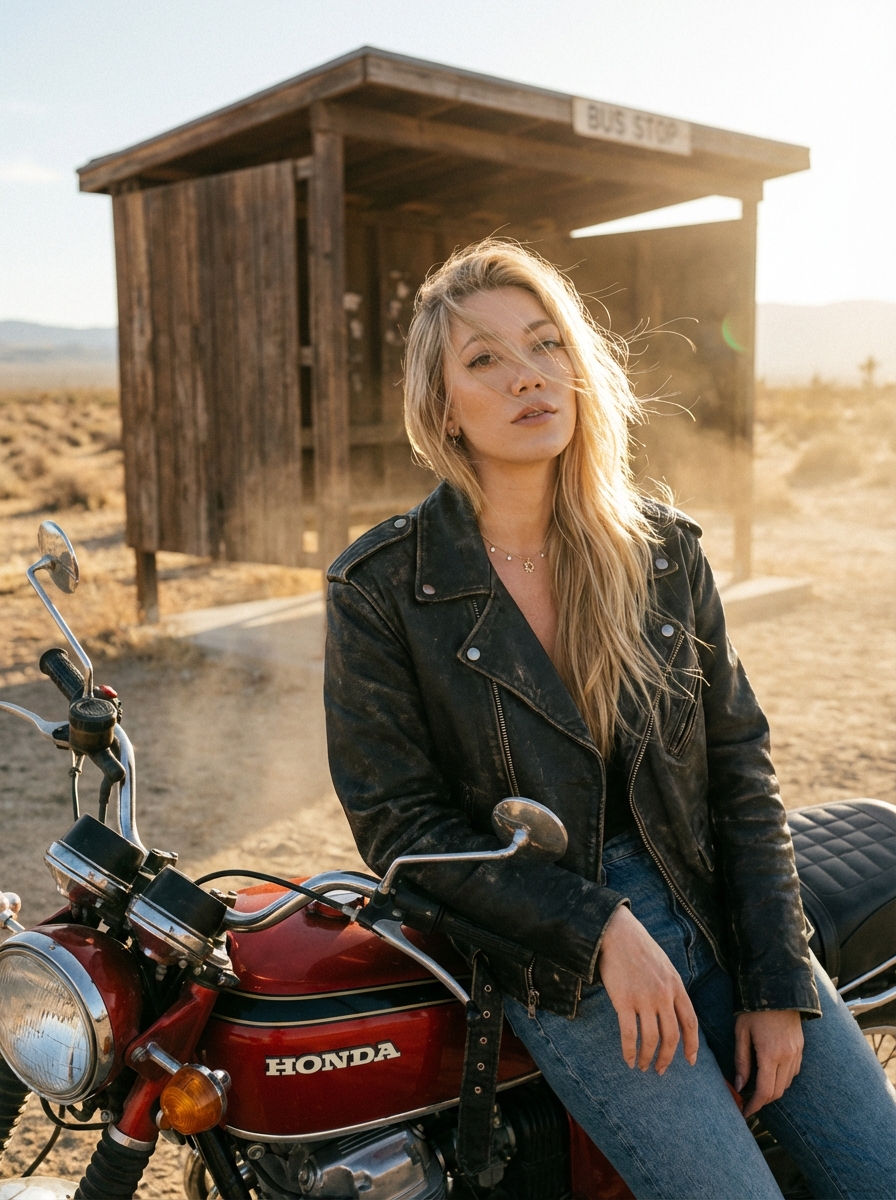 {"image_request": {"goal": "A hyper-realistic cinematic portrait of an extraordinarily beautiful model with short hair covering one eye leaning casually on a red motorcycle beside a lonely bus station in the middle of an untamed wilderness.", "meta": {"image_type": "Cinematic Portrait", "quality": "8k Masterpiece with analog imperfections", "color_mode": "High Contrast with dusty earth tones", "style_mode": "Neo-Cinematic with Analog Film Texture", "aspect_ratio": "4:5", "resolution": "4096x5120"}, "creative_style": "A blend of Denis Villeneuve desert cinematography, 1980s Vogue editorial edge, Wim Wenders Americana solitude, and a hint of cyber-western surrealism.", "overall_theme": "Beauty in isolation at a forgotten crossing", "mood_vibe": "Quiet, confident, atmospheric, slightly melancholic", "style_keywords": ["analog grain", "wind-swept hair ", "chrome reflections", "cinematic depth", "sun-faded signage", "subtle imperfection", "bokeh haze", "volumetric dust", "hyperreal skin", "desert solitude"], "subject": {"count": "1", "type": "Human", "identity": "A strikingly beautiful model with a mysterious presence", "age_appearance": "Mid 20s", "skin": "Smooth realistic texture with visible pores, subtle sun-kissed tone, faint freckles across the cheekbones", "facial_features": {"expression": "Calm confidence with a touch of introspective distance", "eyes": "One eye hidden under hair; visible eye is deep green with razor-sharp highlight"}, "hair": {"style": "Short asymmetrical cut draping over one eye ", "texture": "Slightly windswept with natural movement", "color": "hair"}, "clothing": {"top": "Fitted black leather jacket with worn creases and matte finish", "bottom": "Dark denim riding pants, dust-kissed at the knees", "accessories": "Single silver ring, thin chain necklace peeking under jacket collar ", "condition": "Lightly worn, giving authentic travel vibes"}, "props": {"primary": "A vintage red motorcycle with chrome detailing", "secondary": "Weathered wooden bus-stop sign, rusted metal bench, scattered dry grass tufts"}}, "pose_action": {"description": "She leans against the motorcycle with one arm resting on the seat, body turned slightly toward camera as the wind pulls gently at her jacket.", "body_position": "Leaning, relaxed posture with one leg crossed at the ankle", "camera_interaction": "Looking slightly past the camera, not directly at it"}, "environment": {"setting": "A remote bus station in a vast wilderness of dry plains and low hills", "time_of_day": "Late golden hour", "weather": "Clear with drifting dust carried by warm wind", "atmosphere": "Dry, cinematic, softly glowing in warm light"}, "lighting": {"type": "Golden hour directional with rim lighting", "source": "Low sun casting warm highlights", "quality": "Soft but directional, creating sculpted cheekbones and metallic shimmer on motorcycle", "shadows": "Long, warm, gently feathered shadows", "imperfections": "Lens flare streak, mild chromatic aberration at frame edges"}, "camera": {"sensor_format": "Medium Format Digital", "lens": "85mm portrait lens", "aperture": "f/1.6 for creamy cinematic bokeh", "shutter_speed": "1/320 to catch subtle hair movement", "composition": "Rule of thirds with shallow depth, model angled slightly to left, bus stop receding in background"}, "scene_specific_details": {"texture_focus": "Leather jacket grain, chrome motorcycle reflections, cracked wooden bus-stop post", "layout": "Minimal yet evocative, open landscape emphasizing isolation", "tonality_texture": "Fine film grain with warm halation around highlights"}, "color_grading": {"palette": "Rust red, sand beige, black leather, golden amber", "lut": "Kodak Gold warm desert LUT", "mood": "Warm, solitary, cinematic wanderlust"}, "negative": {"style": "Avoid cartoon or digital 3D look", "content": "No extra limbs, distorted hands, random text, watermark", "artifacts": "Avoid oversharpening, muddy shadows, AI deformations"}}}