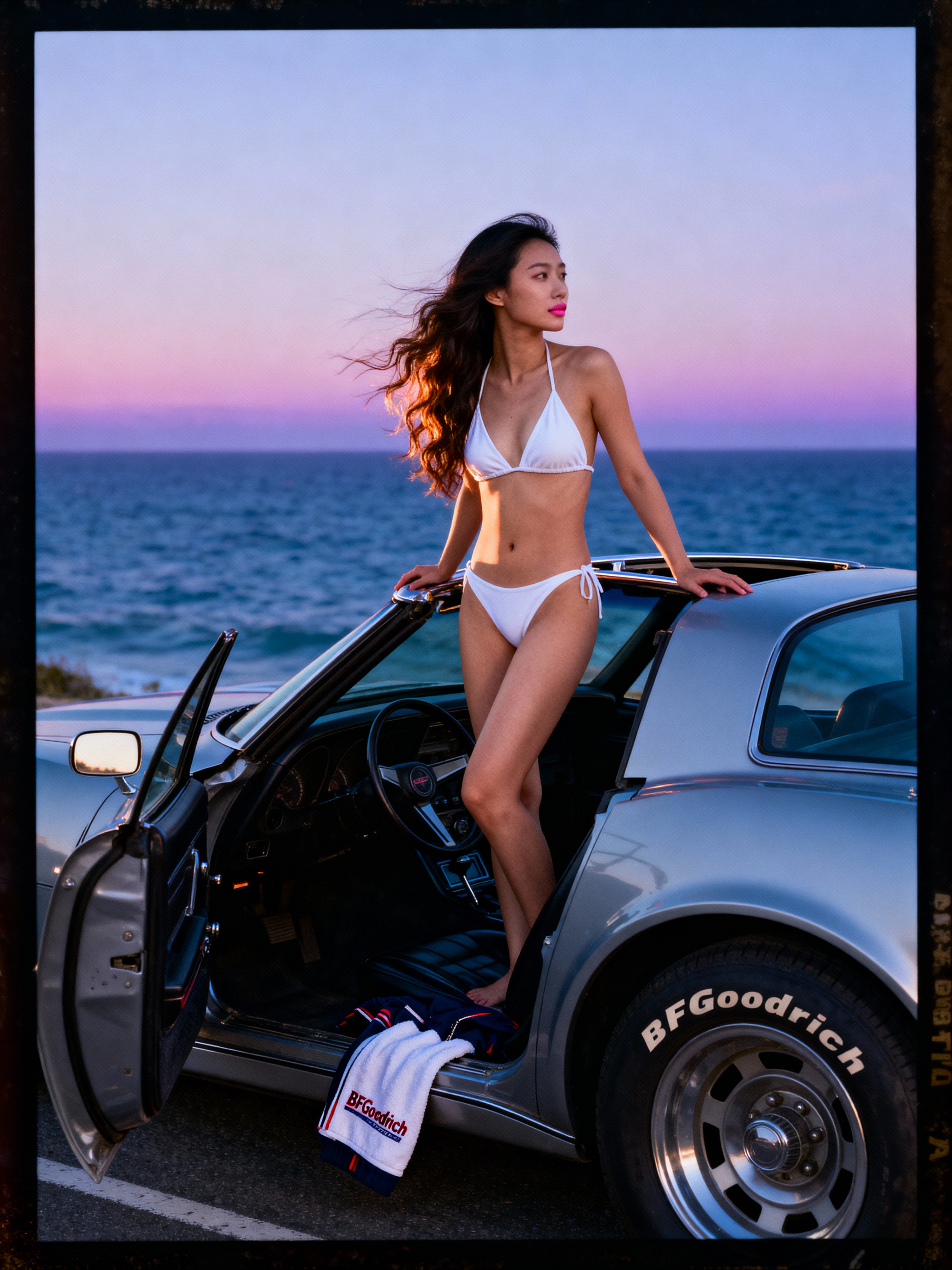 {"image_request": {"goal": "Create a nostalgic vintage 70s coastal lifestyle portrait / analog film aesthetic / summer sunset vibe / classic car editorial", "meta": {"image_type": "Analog Film Photography / Vintage Lifestyle Editorial", "quality": "Best Quality, Ultra-Detailed, Film Grain, Authentic Texture", "color_mode": "Vintage Kodachrome / Warm Sunset tones with Cool Blues / Analog Film Scan", "style_mode": "retro analog", "aspect_ratio": "4:5", "resolution": "1440x1920"}, "creative_style": "Vintage 70s/80s coastal lifestyle aesthetic, Kodachrome film look with authentic grain, nostalgic summer evening atmosphere, relaxed and candid energy, soft focus, retro fashion editorial", "overall_theme": "nostalgic summer road trip / vintage car beachside / classic Americana / coastal dusk", "mood_vibe": "serene confidence / nostalgic / relaxed / cool / dreamy / atmospheric", "style_keywords": ["35mm film", "vintage grain", "Kodachrome", "C3 Corvette", "golden hour", "beachside", "retro aesthetic", "analog photography", "scanned photo border"], "subject": {"count": "1", "type": "model", "identity": "young model, sun-kissed, fit physique, hair", "identity_preservation": {"description": "Natural beauty, relaxed expression, looking off-camera", "notes": "Maintain the effortless, wind-swept look"}, "age_appearance": "early 20s", "skin": "sun-kissed, glowing, natural texture with film grain", "makeup": {"lips": "natural nude/pink", "eyes": "minimal natural", "general": "fresh-faced beach look."}, "facial_features": {"expression": "contemplative, looking away to the side, serene", "eyes": {"gaze": "looking to the right (her left), avoiding the camera", "intensity": "soft and dreamy"}}, "hair": {"length": "long, past shoulders", "texture": "wavy, beachy texture, wind-swept", "style": "loose and flowing", "lighting_interaction": {"light": "soft sunset glow catching highlights", "shadow_play": "soft shadows adding volume"}}, "clothing": {"top": "triangle if(gender=f){bikini top} ", "bottom": "if(gender=f){bikini bottom} s", "full_description": "classic two-piece triangle bikini ", "accessories": "minimal/none"}, "props": {"car": "Vintage C3 Corvette (shark body), open driver's door, T-top removed", "details": "BFGoodrich Radial T/A letter tires visible, retro wheel rims", "other": "Vintage racing jacket or towel resting on the door sill"}}, "pose_action": {"description": "Standing inside the open door frame of the car, elevated position", "overall_pose": "Standing tall in the car door opening, rising out of the seat", "head_turn": "Turned to the side (profile view)", "gaze": "Looking out toward the horizon/sunset", "hands": "Resting on the car's roof frame/windshield bar for support", "body_position": "Frontal to camera but head turned, standing on the door sill or seat area."}, "environment": {"setting": "Coastal road or beachside parking", "location": "Overlooking the ocean", "weather": "Clear evening, twilight", "time_of_day": "Dusk / Blue Hour transition / Late Golden Hour", "atmosphere": "Calm, breezy, saline, nostalgic summer evening"}, "background": {"color": "Deep ocean blues, soft purple/pink sky gradient", "effect": "Soft focus ocean horizon, textured water surface"}, "lighting": {"type": "Natural soft light", "direction": "Side lighting (sunset)", "intensity": "Soft, diffused", "tone": "Warm highlights on skin, cool ambient shadows", "mood": "Romantic, nostalgic, serene", "imperfections": ["film grain", "soft focus", "slight vignette", "color shift"]}, "camera": {"sensor_format": "35mm Analog Film", "lens": "50mm prime", "position_angle": "Eye-level or slightly low angle", "distance": "Medium shot (knees up)", "framing": "Centered subject, car framing the bottom and sides", "depth_of_field": "Moderate (subject sharp, background slightly softened)"}, "color_grading": {"palette": "White (car/bikini ), Tan (skin), Deep Blue (ocean), Soft Pink/Purple (sky)", "lut": "Vintage Kodachrome / Fujifilm Superia emulation", "mood": "Retro summer nostalgia"}, "post_processing": {"sharpening": "Soft analog sharpness", "final_touch": "Add rough photo border/frame, heavy film grain, slight fade in blacks."}, "negative": {"style": "digital, polished, 3d render, cartoon, plastic, over-saturated, hdr", "content": "closed door, modern car, crowded background, direct eye contact"}, "additional_controls": {"focus_emphasis": "Subject and the vintage car door", "special_notes": "Ensure the 'BFGoodrich' text on the tire is legible to ground the vintage feel. The image should look like a scanned photo from the late 70s or early 80s.", "vibe": "Old money aesthetic, vintage summer", "final_output_goal": "A convincing vintage photograph scan"}}}