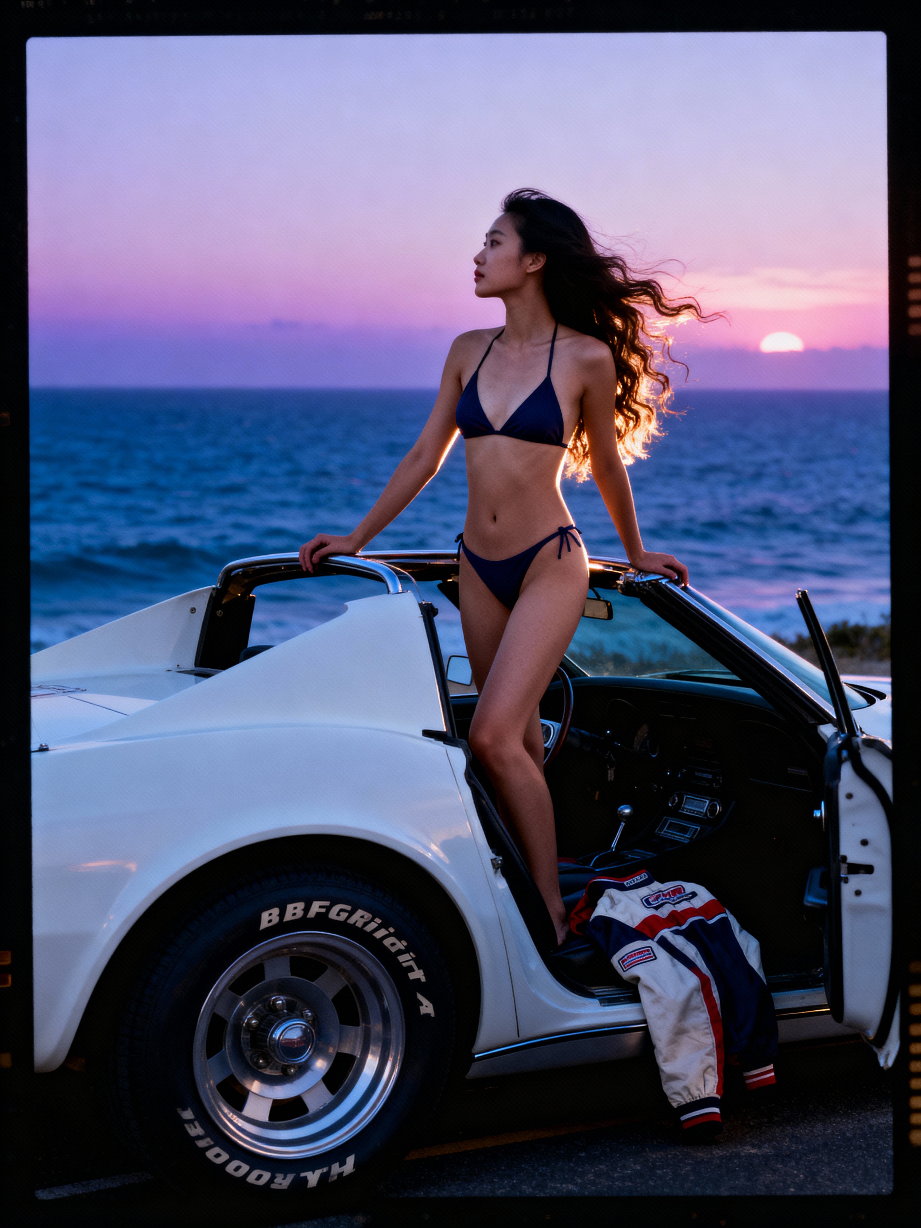{"image_request": {"goal": "Create a nostalgic vintage 70s coastal lifestyle portrait / analog film aesthetic / summer sunset vibe / classic car editorial", "meta": {"image_type": "Analog Film Photography / Vintage Lifestyle Editorial", "quality": "Best Quality, Ultra-Detailed, Film Grain, Authentic Texture", "color_mode": "Vintage Kodachrome / Warm Sunset tones with Cool Blues / Analog Film Scan", "style_mode": "retro analog", "aspect_ratio": "4:5", "resolution": "1440x1920"}, "creative_style": "Vintage 70s/80s coastal lifestyle aesthetic, Kodachrome film look with authentic grain, nostalgic summer evening atmosphere, relaxed and candid energy, soft focus, retro fashion editorial", "overall_theme": "nostalgic summer road trip / vintage car beachside / classic Americana / coastal dusk", "mood_vibe": "serene confidence / nostalgic / relaxed / cool / dreamy / atmospheric", "style_keywords": ["35mm film", "vintage grain", "Kodachrome", "C3 Corvette", "golden hour", "beachside", "retro aesthetic", "analog photography", "scanned photo border"], "subject": {"count": "1", "type": "model", "identity": "young model, sun-kissed, fit physique, hair", "identity_preservation": {"description": "Natural beauty, relaxed expression, looking off-camera", "notes": "Maintain the effortless, wind-swept look"}, "age_appearance": "early 20s", "skin": "sun-kissed, glowing, natural texture with film grain", "makeup": {"lips": "natural nude/pink", "eyes": "minimal natural", "general": "fresh-faced beach look."}, "facial_features": {"expression": "contemplative, looking away to the side, serene", "eyes": {"gaze": "looking to the right (her left), avoiding the camera", "intensity": "soft and dreamy"}}, "hair": {"length": "long, past shoulders", "texture": "wavy, beachy texture, wind-swept", "style": "loose and flowing", "lighting_interaction": {"light": "soft sunset glow catching highlights", "shadow_play": "soft shadows adding volume"}}, "clothing": {"top": "triangle if(gender=f){bikini top} ", "bottom": "if(gender=f){bikini bottom} s", "full_description": "classic two-piece triangle bikini ", "accessories": "minimal/none"}, "props": {"car": "Vintage C3 Corvette (shark body), open driver's door, T-top removed", "details": "BFGoodrich Radial T/A letter tires visible, retro wheel rims", "other": "Vintage racing jacket or towel resting on the door sill"}}, "pose_action": {"description": "Standing inside the open door frame of the car, elevated position", "overall_pose": "Standing tall in the car door opening, rising out of the seat", "head_turn": "Turned to the side (profile view)", "gaze": "Looking out toward the horizon/sunset", "hands": "Resting on the car's roof frame/windshield bar for support", "body_position": "Frontal to camera but head turned, standing on the door sill or seat area."}, "environment": {"setting": "Coastal road or beachside parking", "location": "Overlooking the ocean", "weather": "Clear evening, twilight", "time_of_day": "Dusk / Blue Hour transition / Late Golden Hour", "atmosphere": "Calm, breezy, saline, nostalgic summer evening"}, "background": {"color": "Deep ocean blues, soft purple/pink sky gradient", "effect": "Soft focus ocean horizon, textured water surface"}, "lighting": {"type": "Natural soft light", "direction": "Side lighting (sunset)", "intensity": "Soft, diffused", "tone": "Warm highlights on skin, cool ambient shadows", "mood": "Romantic, nostalgic, serene", "imperfections": ["film grain", "soft focus", "slight vignette", "color shift"]}, "camera": {"sensor_format": "35mm Analog Film", "lens": "50mm prime", "position_angle": "Eye-level or slightly low angle", "distance": "Medium shot (knees up)", "framing": "Centered subject, car framing the bottom and sides", "depth_of_field": "Moderate (subject sharp, background slightly softened)"}, "color_grading": {"palette": "White (car/bikini ), Tan (skin), Deep Blue (ocean), Soft Pink/Purple (sky)", "lut": "Vintage Kodachrome / Fujifilm Superia emulation", "mood": "Retro summer nostalgia"}, "post_processing": {"sharpening": "Soft analog sharpness", "final_touch": "Add rough photo border/frame, heavy film grain, slight fade in blacks."}, "negative": {"style": "digital, polished, 3d render, cartoon, plastic, over-saturated, hdr", "content": "closed door, modern car, crowded background, direct eye contact"}, "additional_controls": {"focus_emphasis": "Subject and the vintage car door", "special_notes": "Ensure the 'BFGoodrich' text on the tire is legible to ground the vintage feel. The image should look like a scanned photo from the late 70s or early 80s.", "vibe": "Old money aesthetic, vintage summer", "final_output_goal": "A convincing vintage photograph scan"}}}