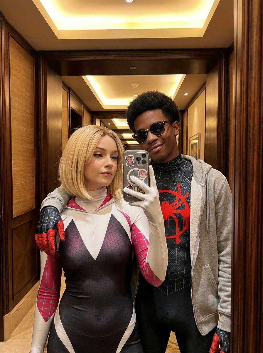 {"image_request": {"goal": "Create an ultra-authentic hyperrealistic mirror selfie / Miles Morales and Gwen Stacy couple/cosplay off-duty vibe / Spider-Verse romance / intimate candid snapshot", "meta": {"image_type": "Hyperrealistic Portrait / Cosplay Lifestyle / Mirror Selfie / Cinematic Character Portrait", "quality": "8K, Ultra-HD, Masterpiece, Best Quality, Ultra-Detailed, Hyperrealistic", "color_mode": "Full Color (warm indoor lighting)", "style_mode": "raw_photoreal / candid superhero / social media aesthetic", "aspect_ratio": "2:3", "resolution": "1080x1620px"}, "creative_style": "Candid social media mirror selfie aesthetic featuring Miles Morales and Gwen Stacy in a relaxed, off-duty moment, wearing their Spider-suits with casual touches, warm ambient lighting, and an intimate atmosphere.", "overall_theme": "superhero romance / off-duty Spider-People / casual intimacy / warm cozy vibe", "mood_vibe": "relaxed / romantic / cool / intimate / authentic / youthful", "style_keywords": ["mirror selfie", "Miles Morales", "Gwen Stacy", "Spider-Verse", "cosplay aesthetic", "spandex texture", "warm lighting", "iPhone stickers", "candid", "couple goals"], "subject": {"count": "2", "type": "couple (superheroes)", "identity": "Young superhero couple. Male: Miles Morales (Black, Afro-, short curly faded hair/afro). model: Gwen Stacy (, shoulder-length blonde bob, blue eyes).", "identity_preservation": {"description": "Preserve the iconic character traits: Miles', Gwen's hair and piercing eyes. Maintain the exact pose from the reference.", "notes": "Miles is wearing his mask pulled up or off (face visible). Gwen has her hood down."}, "age_appearance": "Late teens / early 20s", "skin": "Miles: Rich warm, realistic texture. Gwen: Pale, porcelain with natural flush.", "makeup": {"lips": "Gwen: soft pink natural lip. Miles: natural.", "eyes": "Gwen: subtle definition.", "general": "Fresh, post-hero-duty glow."}, "facial_features": {"expression": "Gwen: soft, confident gaze directed at phone screen. Miles: cool, relaxed, slightly protective expression behind sunglasses (optional) or just looking cool.", "eyes": {"gaze": "Both looking at the mirror reflection.", "intensity": "Intimate and relaxed."}, "lips": {"gesture": "Relaxed."}}, "hair": {"length": "Gwen: iconic blonde bob. Miles: short textured afro.", "texture": "Realistic hair strands.", "style": "Casual, slightly messy.", "lighting_interaction": {"light": "Warm overhead light catching the hair and defining Miles' curls.", "shadow_play": "Soft facial shadows."}}, "clothing": {"top": "Miles: Classic and Red Spider-model suit (Miles design) with a casual grey hoodie worn unzipped over it (homage to Into the Spider-Verse). Gwen: Iconic Spider-Gwen suit (White, Black, Pink, and Teal details) with the hood down.", "bottom": "Miles: suit legs visible. Gwen: suit legs.", "full_description": "Miles wears his signature and red suit with spray-paint logo, layered with a casual grey hoodie. Gwen wears her white, pink, and bodysuit . High-quality textured spandex/fabric materials.", "accessories": "Miles: Wearing cool sunglasses (like the reference). Gwen: Holding iPhone with sticker-bomb case."}, "props": {"bouquet": "N/A", "wine_glass": "N/A", "other": "iPhone Pro in hand."}}, "pose_action": {"description": "Standing mirror selfie in a hallway.", "overall_pose": "Gwen standing in front holding the phone. Miles standing immediately behind her, leaning in slightly.", "head_turn": "Both facing the mirror.", "gaze": "Directed at the mirror/phone.", "body_position": "Standing close together, intimate proximity.", "hands": "Gwen holding phone. Miles' arm draped affectionately around her neck/shoulder.", "movement": "Static selfie pose."}, "environment": {"setting": "Luxury hotel room hallway or modern apartment", "location": "Indoors", "weather": "N/A", "time_of_day": "Evening/Artificial light", "atmosphere": "Warm, private, safe haven"}, "background": {"color": "Warm wood tones, beige", "effect": "Reflection shows a narrow hallway with wooden paneling, creating a cozy backdrop for the colorful suits."}, "lighting": {"type": "Artificial overhead recessed lighting", "position": "Ceiling", "direction": "Top-down", "intensity": "Moderate / Warm", "focus": "Evenly lighting the couple", "falloff": "Soft", "light_quality": "Warm tungsten", "source": "Recessed ceiling lights", "tone": "Golden / Warm beige", "mood": "Cozy and romantic", "subject_lighting": "Soft overhead fill reflecting on the suit textures", "environment_lighting": "Warm ambient glow", "color_temperature": "3200K", "contrast_shadow": "Medium contrast", "shadow_quality": "Soft", "imperfections": ["Smartphone camera noise", "Subtle fabric sheen reflections"]}, "camera": {"sensor_format": "Smartphone Sensor", "lens": "26mm equivalent", "position_angle": "Eye-level mirror reflection", "distance": "Arm's length", "framing": "Waist-up vertical shot", "depth_of_field": "Deep", "composition": {"framing": "Couple centered in mirror frame", "depth": "Reflection creates depth", "emphasis": "Suit details and chemistry", "angle": "Straight-on mirror angle"}}, "color_grading": {"palette": "White, Pink, Black, Red (Suits) contrasting with Warm Beige/Wood background", "lut": "Warm Interior / Cinematic Hero / Soft Gold", "mood": "Warm / Romantic / Iconic"}, "post_processing": {"sharpening": "High fidelity on suit textures (webbing patterns)", "final_touch": "Warm color balance"}, "negative": {"style": "drawing, painting, illustration, 3d render, cold lighting, cartoon, anime", "content": "mask on (for faces to be visible), distorted faces, bad anatomy, extra fingers, plain clothes", "artifacts": "warped mirror, pixelation"}, "additional_controls": {"focus_emphasis": "The characters' faces and the details of their suits.", "grounding": "N/A", "special_notes": "Ensure Miles is wearing the grey hoodie OVER the suit to match the reference photo's silhouette while keeping his character iconic.", "vibe": "Spider-Verse cou