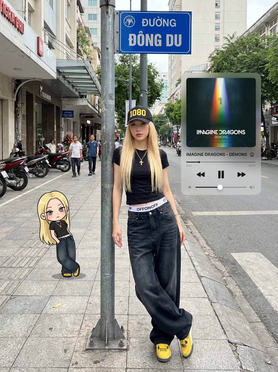 {"image_request": {"goal": "Urban Gen Z street fashion portrait of a blonde model with personalized AR overlays", "meta": {"image_type": "Hyperrealistic Portrait / Mixed Media / Urban Street Style / Social Media Aesthetic", "quality": "8K, Ultra-HD, Masterpiece, Best Quality, Ultra-Detailed, Photorealistic with Graphic Elements", "color_mode": "Full Color (Natural Daylight) / Vibrant Accents / Digital UI Overlay", "style_mode": "raw_photoreal / urban_streetwear / mixed_media_collage", "aspect_ratio": "3:4", "resolution": "1080x1920"}, "creative_style": "Contemporary street fashion photography blended with surreal mixed-media collage elements, social media story aesthetic, Y2K revival vibe, effortless cool, urban texture", "overall_theme": "Y2K fashionable party night / urban chill / viral social media post / augmented reality fashion", "mood_vibe": "cool confident relaxed/urban trendy/playful digital nostalgia", "style_keywords": ["streetwear", "baggy jeans", "Y2K fashion", "augmented reality", "music player widget", "anime avatar", "urban backdrop", "candid", "influencer aesthetic"], "subject": {"count": "1", "type": "model", "identity": "young model, Gen Z aesthetic, long straight hair ", "identity_preservation": {"description": "Preserve cool, detached expression and specific outfit details", "notes": "Focus on the juxtaposition of realistic photography and digital stickers."}, "age_appearance": "early 20s", "skin": "natural texture, soft daylight illumination", "makeup": {"lips": "natural", "eyes": "obscured by cap shadow", "general": "minimal fresh look."}, "facial_features": {"expression": "relaxed, looking down/away, cool indifference", "eyes": {"gaze": "downward or obscured", "intensity": "low/relaxed"}, "lips": {"gesture": "neutral/relaxed"}}, "hair": {"length": "long", "texture": "straight, smooth", "style": "loose blonde strands falling over shoulders, under cap", "lighting_interaction": {"light": "soft natural highlights on hair", "shadow_play": "brim of hat casting shadow over eyes"}}, "clothing": {"top": "tight baby tee with subtle graphic text", "bottom": "extremely baggy dark wash denim jeans, low-rise", "full_description": "fitted baby tee , oversized baggy dark denim jeans, visible white 'OFFONOFF' branded underwear waistband, belt with grommets, trucker hat with yellow '1080' text, yellow sneakers", "accessories": "Gold cross necklace, shoulder bag, silver rings"}, "props": {"bouquet": "N/A", "wine_glass": "N/A", "other": "Silver street pole (leaning on), floating translucent music player widget (Song: 'Demons' - Artist: Imagine Dragons), mini 2D cartoon chibi version of subject mimicking her exact pose standing next to her."}}, "pose_action": {"description": "Subject leaning casually back against a street pole on a sidewalk", "overall_pose": "standing leaning back against pole, legs crossed at ankles", "head_turn": "facing forward but tilted down", "gaze": "downward", "body_position": "relaxed slump against vertical pole", "hands": "relaxed at sides / near pockets", "movement": "static pose"}, "environment": {"setting": "Urban street corner/city sidewalk", "location": "outdoor sidewalk next to cafe", "weather": "overcast daylight", "time_of_day": "daytime/afternoon", "atmosphere": "casual urban bust le, grey pavement, city vibes"}, "background": {"color": "urban greys / building facade", "effect": "natural depth of field, background slightly out of focus"}, "lighting": {"type": "natural overcast daylight", "position": "overhead diffused", "direction": "soft top-down", "intensity": "moderate/soft", "focus": "even illumination on subject", "falloff": "gentle", "light_quality": "diffused, soft shadows", "source": "sky", "tone": "neutral / slightly cool daylight", "mood": "casual/everyday", "subject_lighting": "even natural light", "environment_lighting": "ambient daylight", "color_temperature": "5500K daylight", "contrast_shadow": "soft ambient occlusion", "shadow_quality": "soft diffused", "imperfections": []}, "camera": {"sensor_format": "Smartphone / Digital mirrorless", "lens": "28mm or 35mm wide-angle", "position_angle": "eye-level or slightly low angle", "distance": "full body shot", "framing": "vertical portrait framing including feet and headroom for widgets", "depth_of_field": "moderate depth (f/4 or f/5.6)", "composition": {"framing": "Full body shot", "depth": "subject separated from background building", "emphasis": "outfit details and digital overlays", "angle": "front-facing"}}, "color_grading": {"palette": "Urban neutrals (grey, white, denim blue) with a pop of yellow (shoes, hat text) and hair", "lut": "Social media influencer preset / Clean Urban / Low Contrast", "mood": "cool, desaturated with specific color pops"}, "post_processing": {"sharpening": "standard digital sharpening", "final_touch": "overlay of translucent iOS music player widget showing 'Demons' by Imagine Dragons and a small cartoon sticker of the blonde model mimicking the exact pose"}, "negative": {"style": "painting, drawing, sketch (for main subject), blurry, low res, overexposed", "content": "deformed hands, missing limbs, extra legs, bad anatomy, wrong song title", "artifacts": "glitch, noise"}, "additional_controls": {"focus_emphasis": "Street style outfit and surreal floating UI elements", "grounding": "Subject firmly leaning on pole, feet grounded on tactile paving", "special_notes": "Include blue street sign 'ĐƯỜNG ĐÔNG DU' on the pole above. Include floating music player UI on right (Imagine Dragons - Demons) and chibi blonde character on left mimicking exact pose.", "vibe": "Gen Z fit check", "final_output_goal": "A photorealistic street fashion shot of a blonde model with stylized augmented reality graphic overlays."}}}