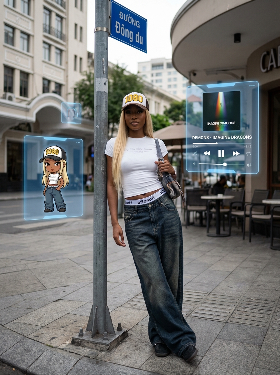 {"image_request": {"goal": "Urban Gen Z street fashion portrait of a blonde model with personalized AR overlays", "meta": {"image_type": "Hyperrealistic Portrait / Mixed Media / Urban Street Style / Social Media Aesthetic", "quality": "8K, Ultra-HD, Masterpiece, Best Quality, Ultra-Detailed, Photorealistic with Graphic Elements", "color_mode": "Full Color (Natural Daylight) / Vibrant Accents / Digital UI Overlay", "style_mode": "raw_photoreal / urban_streetwear / mixed_media_collage", "aspect_ratio": "3:4", "resolution": "1080x1920"}, "creative_style": "Contemporary street fashion photography blended with surreal mixed-media collage elements, social media story aesthetic, Y2K revival vibe, effortless cool, urban texture", "overall_theme": "Y2K fashionable party night / urban chill / viral social media post / augmented reality fashion", "mood_vibe": "cool confident relaxed/urban trendy/playful digital nostalgia", "style_keywords": ["streetwear", "baggy jeans", "Y2K fashion", "augmented reality", "music player widget", "anime avatar", "urban backdrop", "candid", "influencer aesthetic"], "subject": {"count": "1", "type": "model", "identity": "young model, Gen Z aesthetic, long straight hair ", "identity_preservation": {"description": "Preserve cool, detached expression and specific outfit details", "notes": "Focus on the juxtaposition of realistic photography and digital stickers."}, "age_appearance": "early 20s", "skin": "natural texture, soft daylight illumination", "makeup": {"lips": "natural", "eyes": "obscured by cap shadow", "general": "minimal fresh look."}, "facial_features": {"expression": "relaxed, looking down/away, cool indifference", "eyes": {"gaze": "downward or obscured", "intensity": "low/relaxed"}, "lips": {"gesture": "neutral/relaxed"}}, "hair": {"length": "long", "texture": "straight, smooth", "style": "loose blonde strands falling over shoulders, under cap", "lighting_interaction": {"light": "soft natural highlights on hair", "shadow_play": "brim of hat casting shadow over eyes"}}, "clothing": {"top": "tight baby tee with subtle graphic text", "bottom": "extremely baggy dark wash denim jeans, low-rise", "full_description": "fitted baby tee , oversized baggy dark denim jeans, visible white 'OFFONOFF' branded underwear waistband, belt with grommets, trucker hat with yellow '1080' text, yellow sneakers", "accessories": "Gold cross necklace, shoulder bag, silver rings"}, "props": {"bouquet": "N/A", "wine_glass": "N/A", "other": "Silver street pole (leaning on), floating translucent music player widget (Song: 'Demons' - Artist: Imagine Dragons), mini 2D cartoon chibi version of subject mimicking her exact pose standing next to her."}}, "pose_action": {"description": "Subject leaning casually back against a street pole on a sidewalk", "overall_pose": "standing leaning back against pole, legs crossed at ankles", "head_turn": "facing forward but tilted down", "gaze": "downward", "body_position": "relaxed slump against vertical pole", "hands": "relaxed at sides / near pockets", "movement": "static pose"}, "environment": {"setting": "Urban street corner/city sidewalk", "location": "outdoor sidewalk next to cafe", "weather": "overcast daylight", "time_of_day": "daytime/afternoon", "atmosphere": "casual urban bust le, grey pavement, city vibes"}, "background": {"color": "urban greys / building facade", "effect": "natural depth of field, background slightly out of focus"}, "lighting": {"type": "natural overcast daylight", "position": "overhead diffused", "direction": "soft top-down", "intensity": "moderate/soft", "focus": "even illumination on subject", "falloff": "gentle", "light_quality": "diffused, soft shadows", "source": "sky", "tone": "neutral / slightly cool daylight", "mood": "casual/everyday", "subject_lighting": "even natural light", "environment_lighting": "ambient daylight", "color_temperature": "5500K daylight", "contrast_shadow": "soft ambient occlusion", "shadow_quality": "soft diffused", "imperfections": []}, "camera": {"sensor_format": "Smartphone / Digital mirrorless", "lens": "28mm or 35mm wide-angle", "position_angle": "eye-level or slightly low angle", "distance": "full body shot", "framing": "vertical portrait framing including feet and headroom for widgets", "depth_of_field": "moderate depth (f/4 or f/5.6)", "composition": {"framing": "Full body shot", "depth": "subject separated from background building", "emphasis": "outfit details and digital overlays", "angle": "front-facing"}}, "color_grading": {"palette": "Urban neutrals (grey, white, denim blue) with a pop of yellow (shoes, hat text) and hair", "lut": "Social media influencer preset / Clean Urban / Low Contrast", "mood": "cool, desaturated with specific color pops"}, "post_processing": {"sharpening": "standard digital sharpening", "final_touch": "overlay of translucent iOS music player widget showing 'Demons' by Imagine Dragons and a small cartoon sticker of the blonde model mimicking the exact pose"}, "negative": {"style": "painting, drawing, sketch (for main subject), blurry, low res, overexposed", "content": "deformed hands, missing limbs, extra legs, bad anatomy, wrong song title", "artifacts": "glitch, noise"}, "additional_controls": {"focus_emphasis": "Street style outfit and surreal floating UI elements", "grounding": "Subject firmly leaning on pole, feet grounded on tactile paving", "special_notes": "Include blue street sign 'ĐƯỜNG ĐÔNG DU' on the pole above. Include floating music player UI on right (Imagine Dragons - Demons) and chibi blonde character on left mimicking exact pose.", "vibe": "Gen Z fit check", "final_output_goal": "A photorealistic street fashion shot of a blonde model with stylized augmented reality graphic overlays."}}}